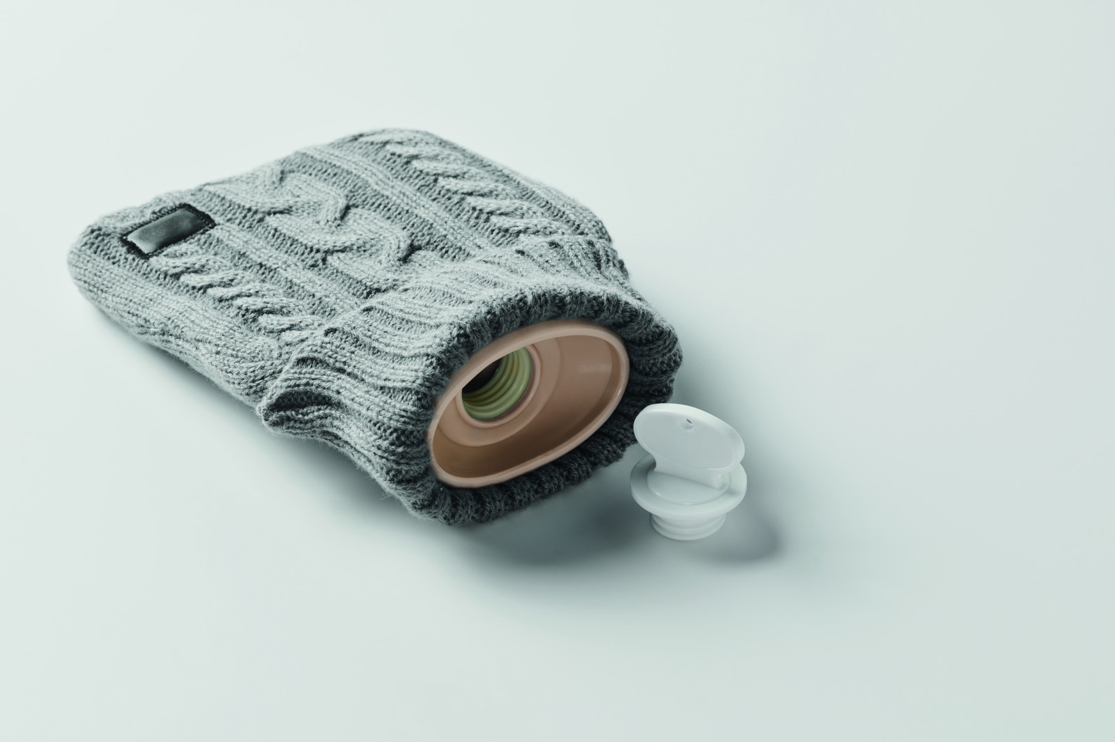 Bouillotte avec housse en acrylique tricotée. Utilisée pour apporter de la chaleur, généralement au lit, mais aussi pour appliquer de la chaleur sur une partie spécifique du corps. Capacité 450 ml.