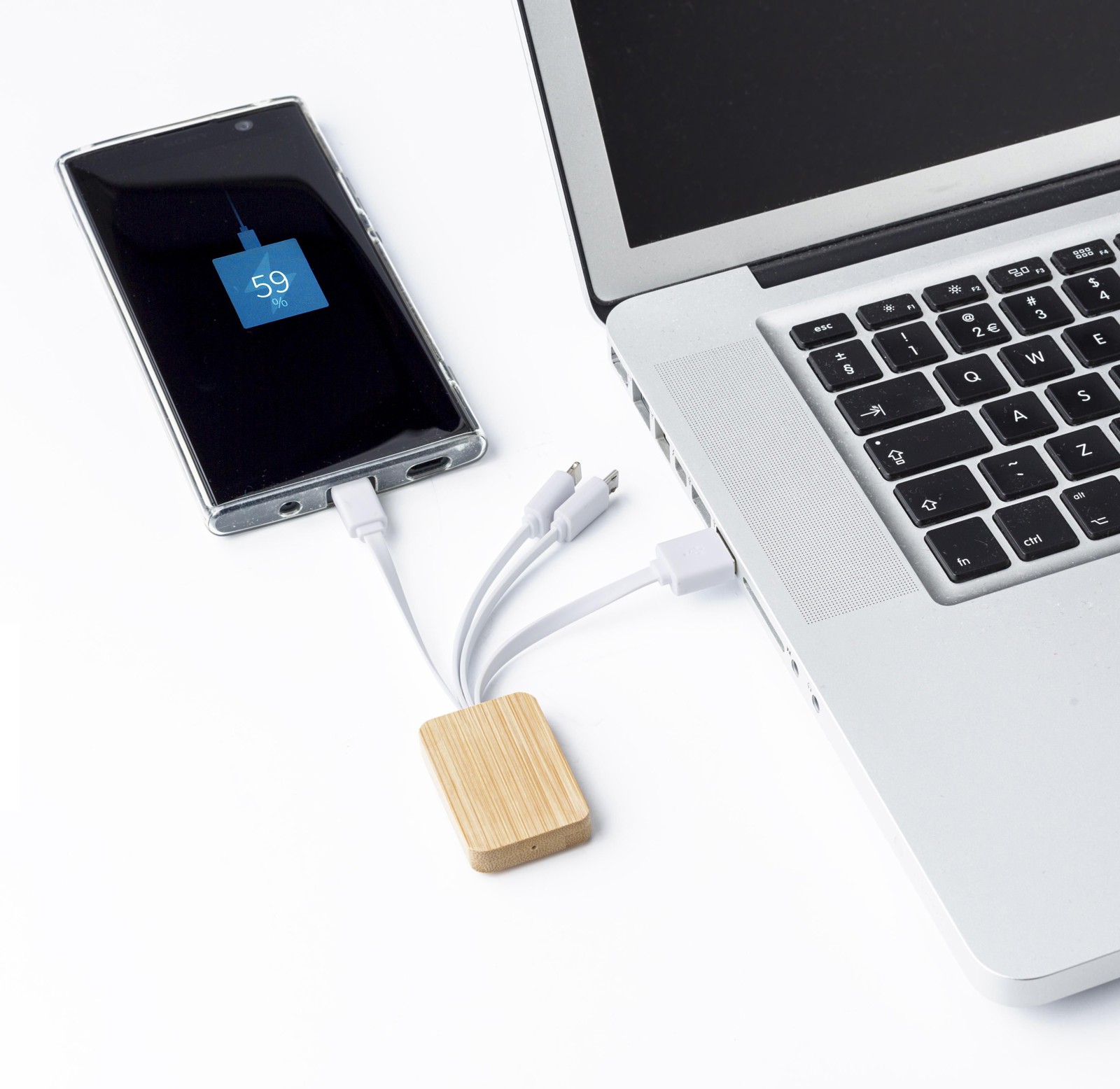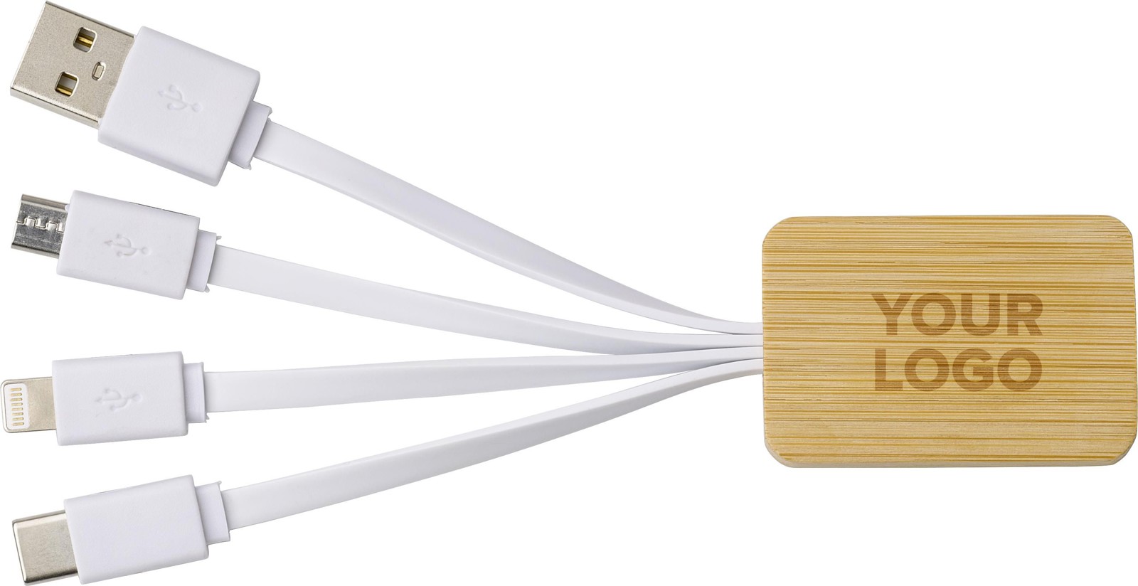 Câble de charge USB en bambou avec connectiques micro-USB, USB-C et USB Lightning. Ce câble convient uniquement aux ordinateurs portables ou aux mobiles mais ne fonctionne pas avec les power banks.