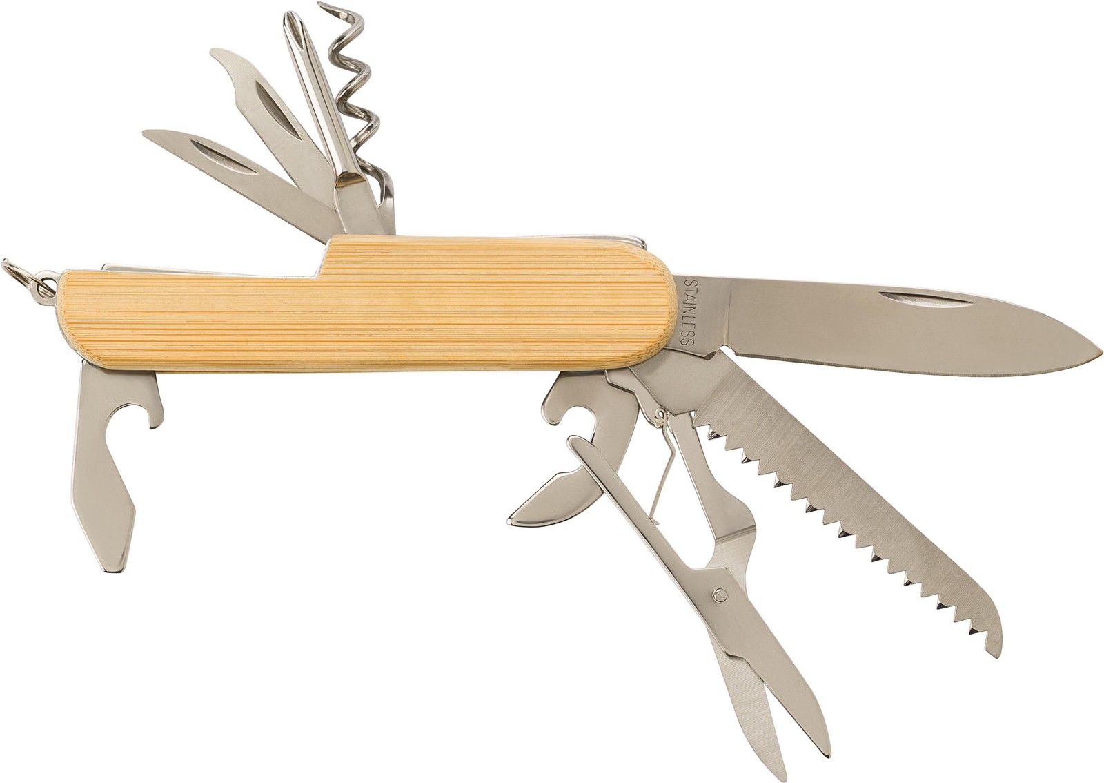 Canif multifonction en bambou et acier inoxydable.