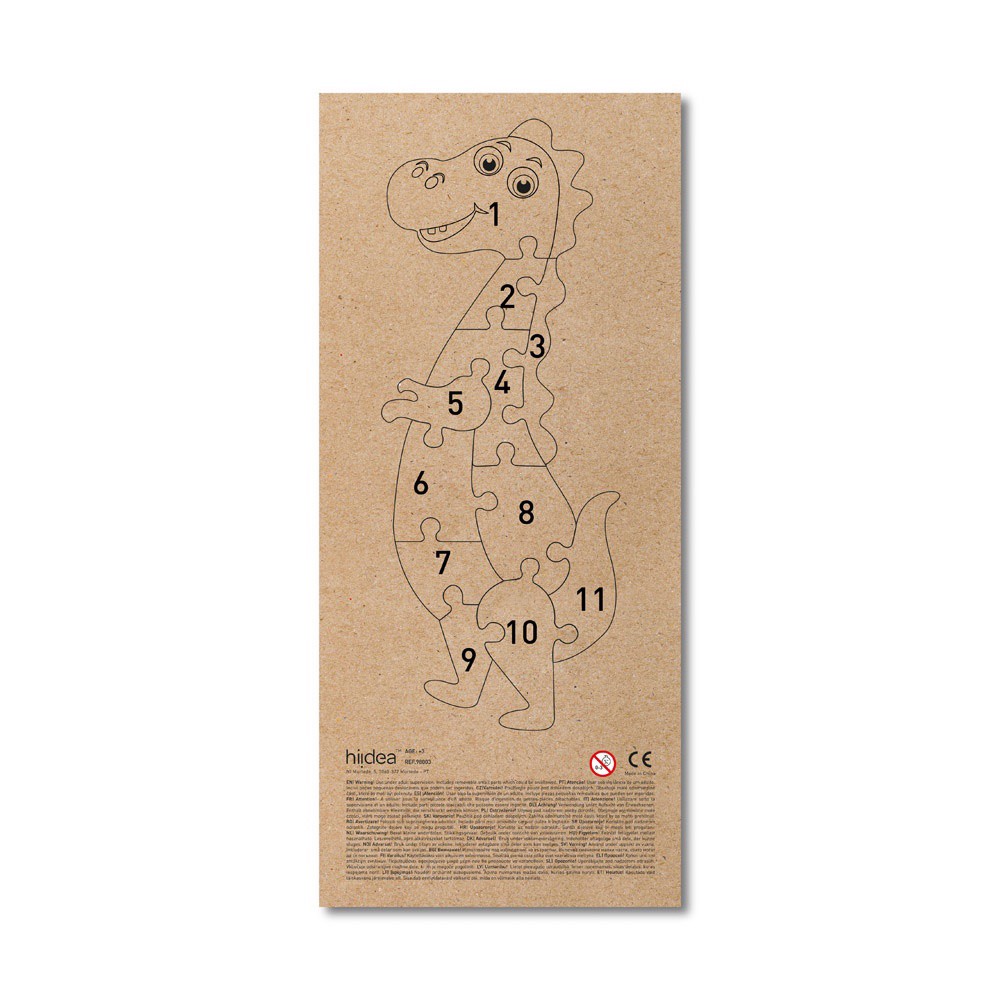 Puzzle en forme de dinosaure en contreplaqué de pin. Chaque pièce est numérotée pour faciliter l'assemblage. Simplement fait en contreplaqué, il est personnalisable. Livré dans une boîte cadeau en papier kraft. Le produit étant fabriqué à partir de matériaux naturels, la couleur du produit ainsi que le résultat de l'impression peuvent varier d'un produit à l'autre. 128 x 298 mm