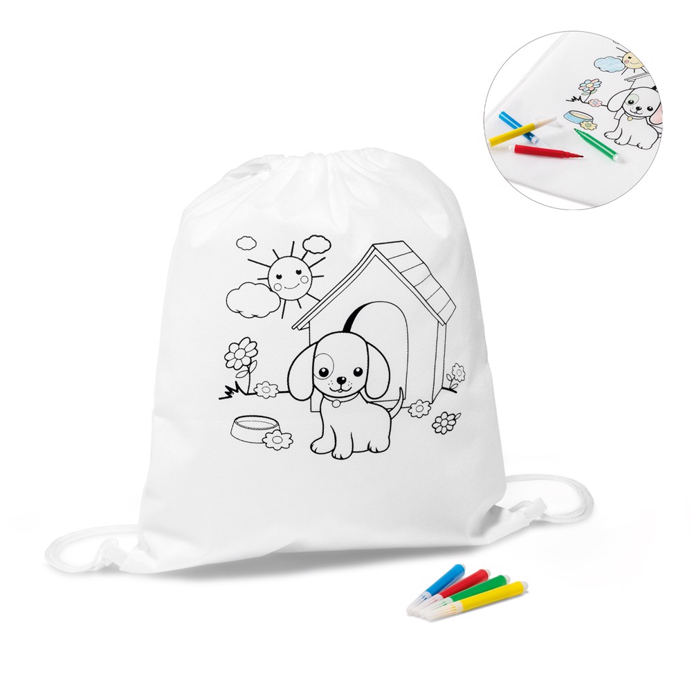 Sac à dos en non tissé avec dessin à colorier (80 g/m²). 4 feutres inclus. Ensemble idéal pour offrir aux enfants. 300 x 350 mm
