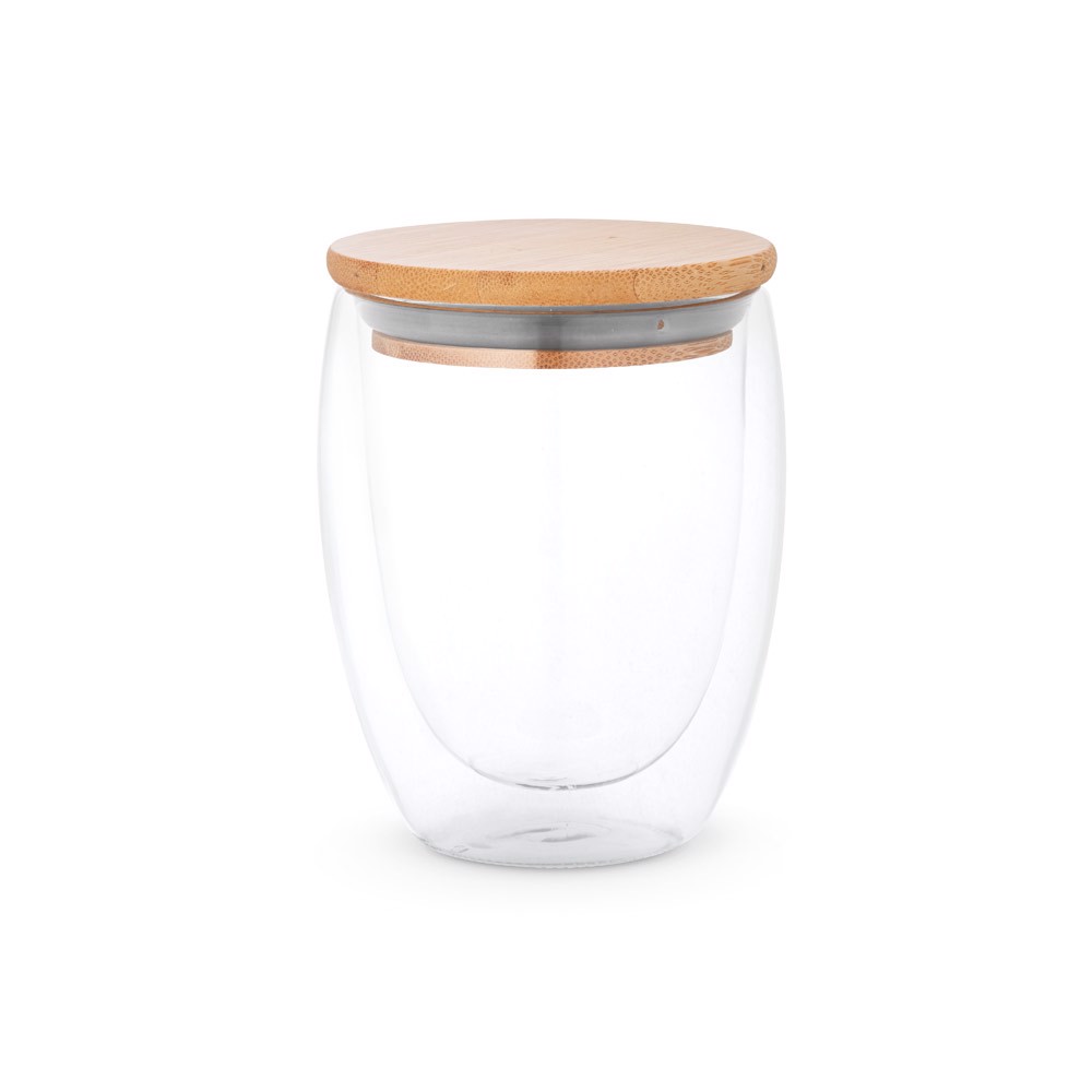 Tasse de voyage en verre borosilicate à double paroi, isolée par l'air, avec couvercle en bambou. Le verre a une capacité allant jusqu'à 350ml, idéal pour les liquides froids ou chauds. Convient au micro-ondes et au lave-vaisselle, en retirant le couvercle. Livré dans une boîte cadeau en papier kraft. Le produit étant fabriqué à partir de matériaux naturels, la couleur du produit ainsi que le résultat de l'impression peuvent varier d'un produit à l'autre. ø91 x 119 mm