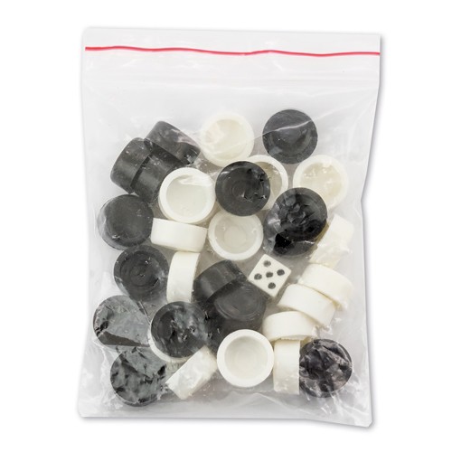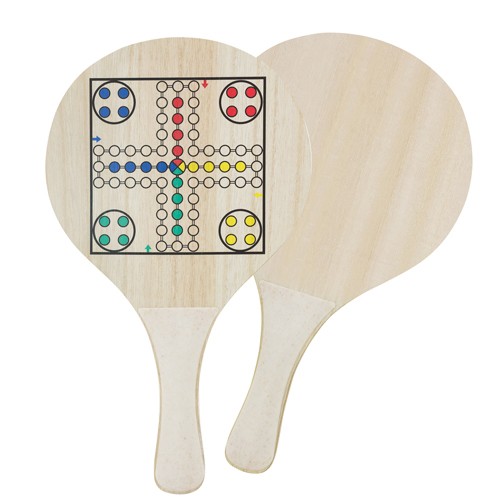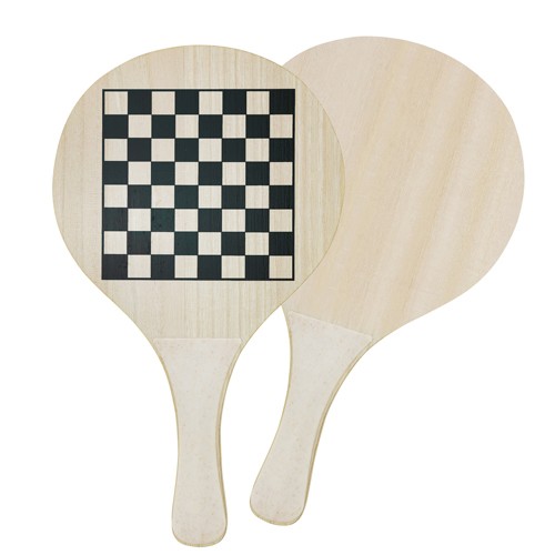 Raquette en bois et fibre de blé avec d'un côté un jeu d'échecs et de l'autre un jeu de parchis. Chaque paire comprend un sac avec des pièces d'échecs, des dames et un ludo.Taille de la raquette 19X33 CM, taille du sac 20,5X35,5 CM.