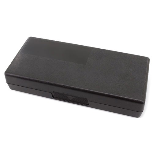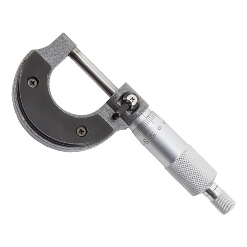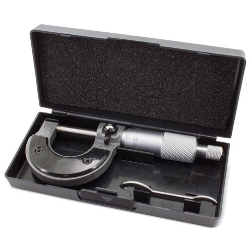 Outil de mesure de haute précision pour les petits objets avec une mesure de centièmes ou millièmes de millimètre. Avec blocage d'arbre. Comprend un étui de protection et de rangement avec un intérieur rembourré.