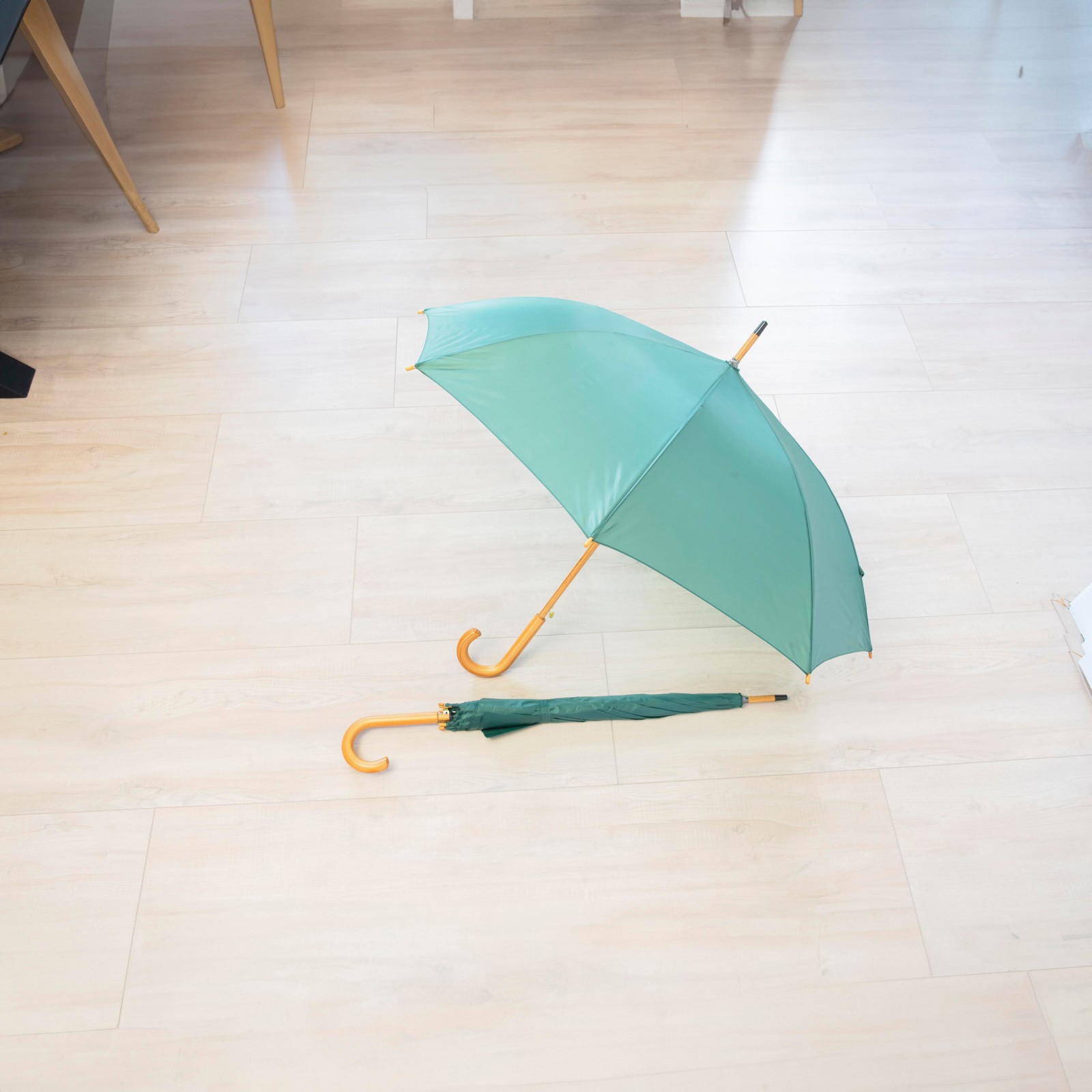 Parapluie golf automatique en polyester 190T, baleines en métal, mât et manche canne en bois.