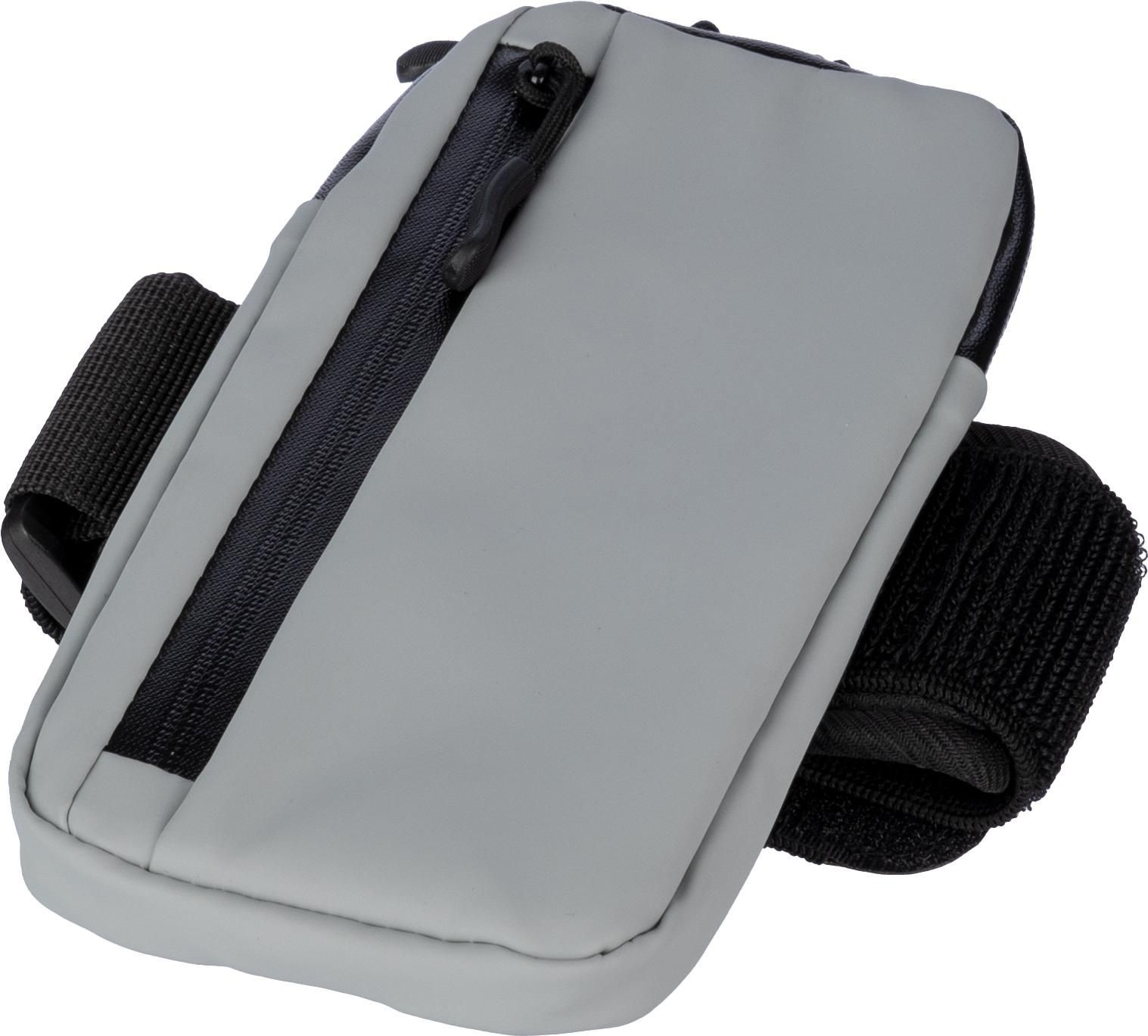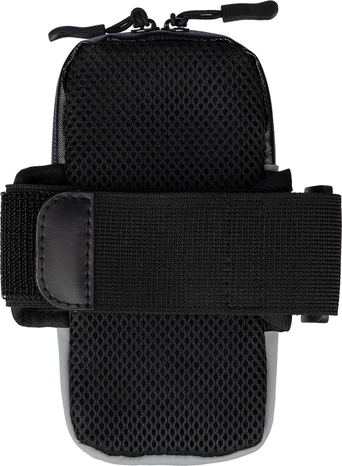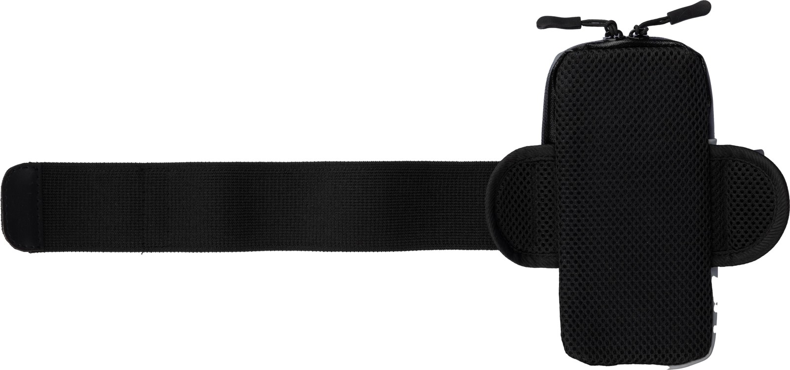 Pochette brassard en PU et polyester comprenant un compartiment et une poche frontale zippés et étanches.