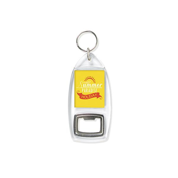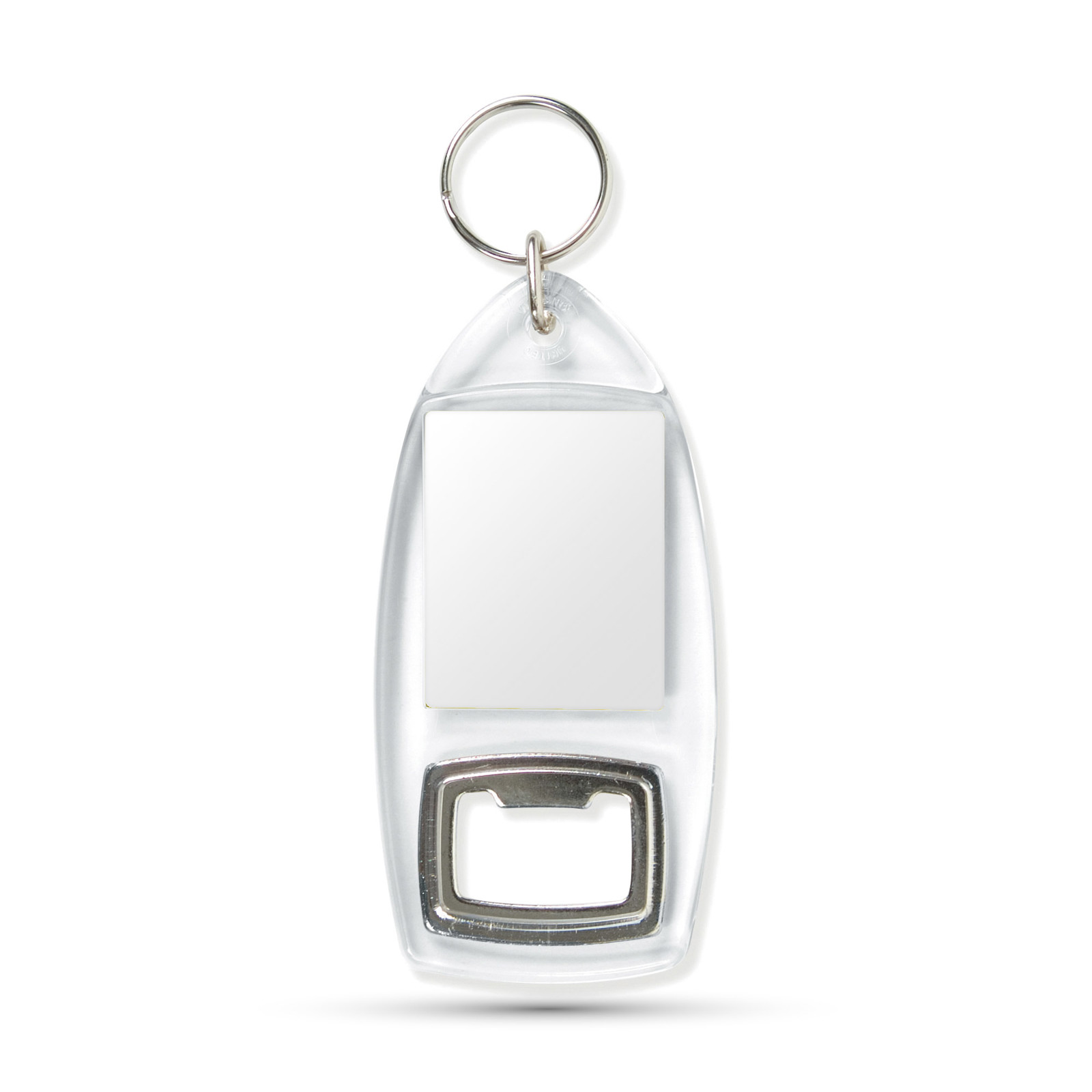 Porte-clés décapsuleur en acrylique CR-AB, avec couvercle transparent et insert papier recto-verso (32x40 mm). Son design arrondi et attrayant permet lutilisation avec photo ou logo. Un cadeau pratique et polyvalent, idéal pour valoriser votre marque avec créativité.