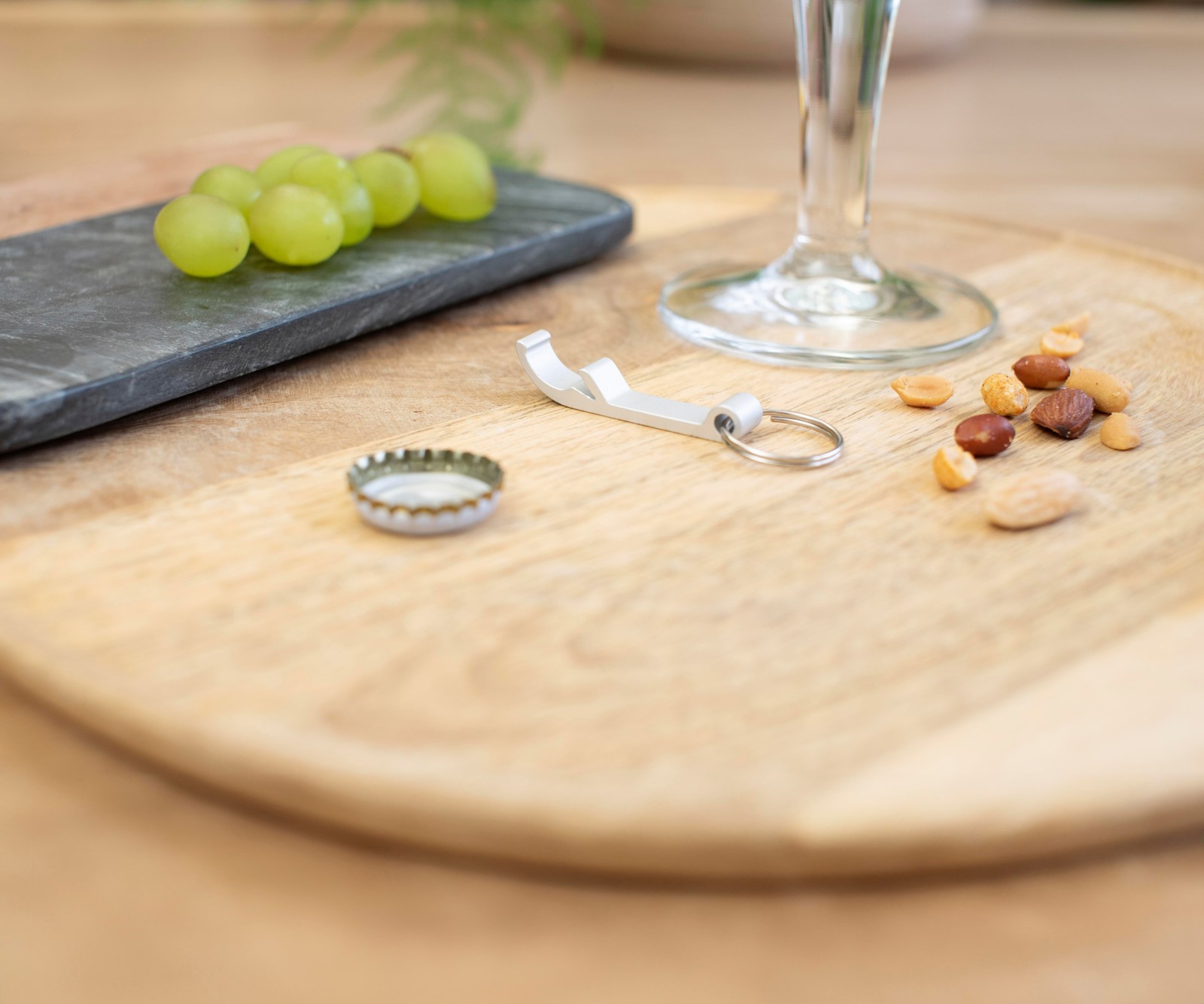 Porte-clés en aluminium avec décapsuleur.
