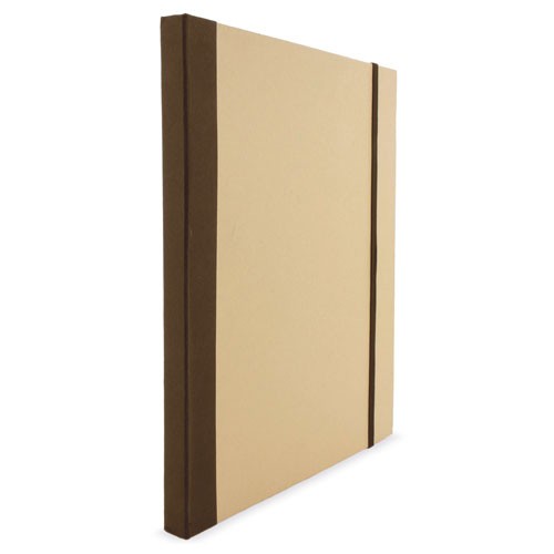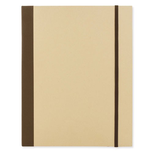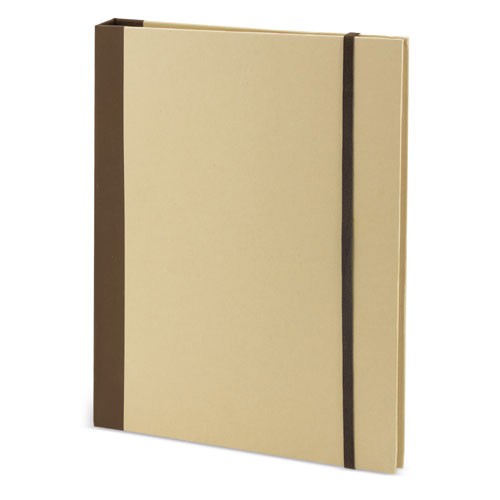 Porte-documents en carton à fermeture élastique et bord renforcé en couleur marron. Il présente un cahier contenant 80 feuilles A4 blanches, un stylo en carton et en plastique, des notes et des autocollants colorés ainsi que différents emplacements pour stocker des documents et cartes de visite.