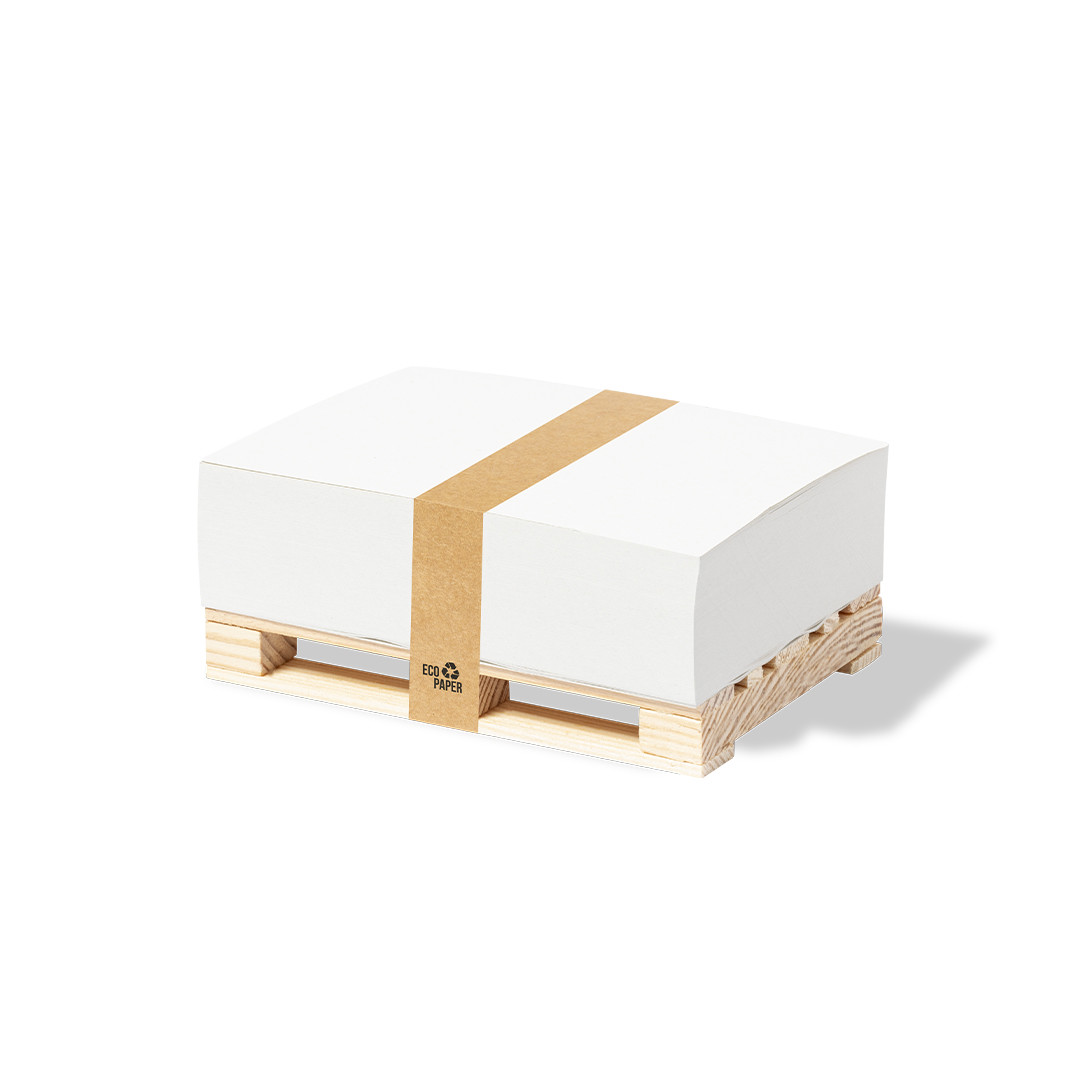 Porte-notes de palette original en bois naturel. Il comprend 300 feuilles de papier écologique et une ceinture en papier kraft avec le logo EcoPaper. 300 Feuilles 7,3 x 11,5 cm