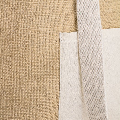 Fabriqué en coton et jute laminé ultra résistant. Comprend une poche extérieure et des poignées extra confortables
