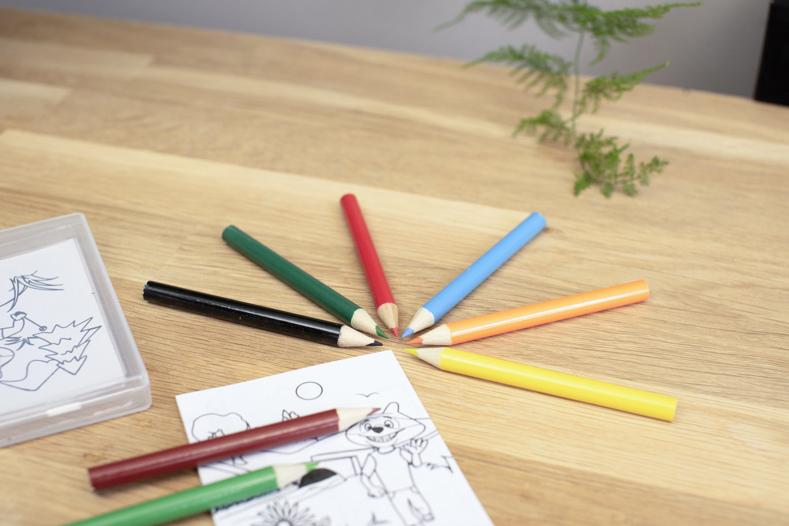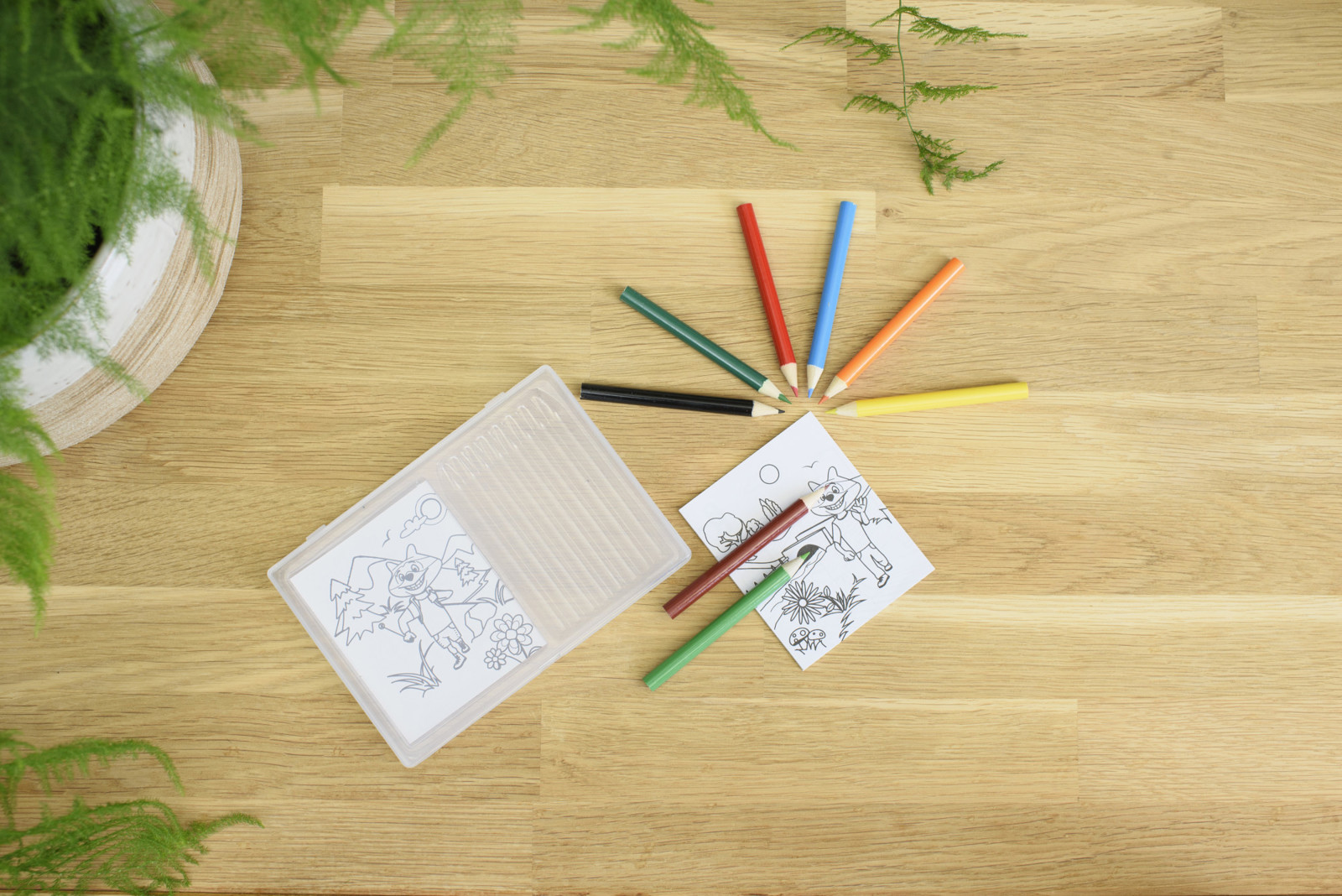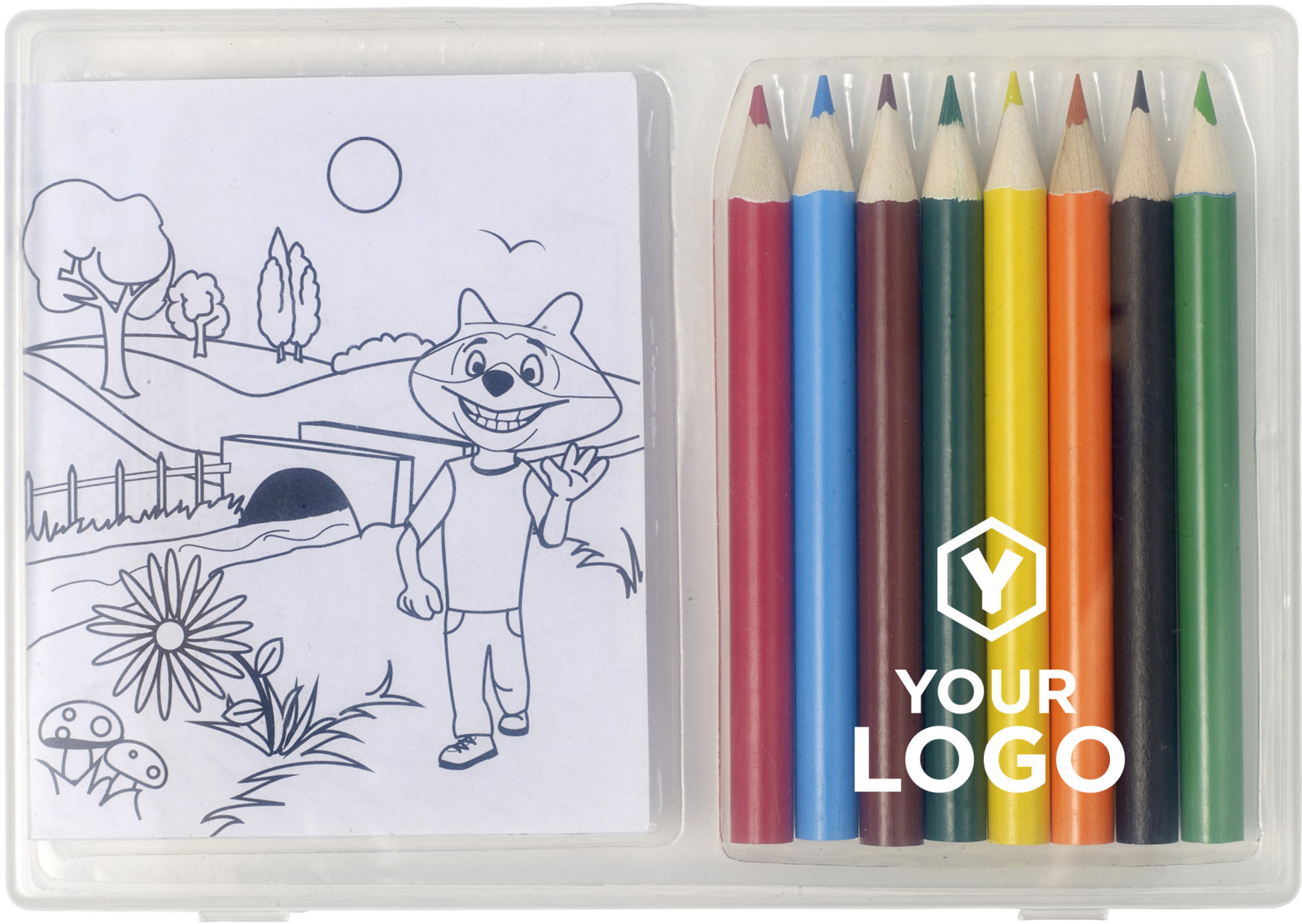 Set à dessin de 8 crayons de couleur et 20 feuilles de coloriage dans une boîte en plastique transparent.