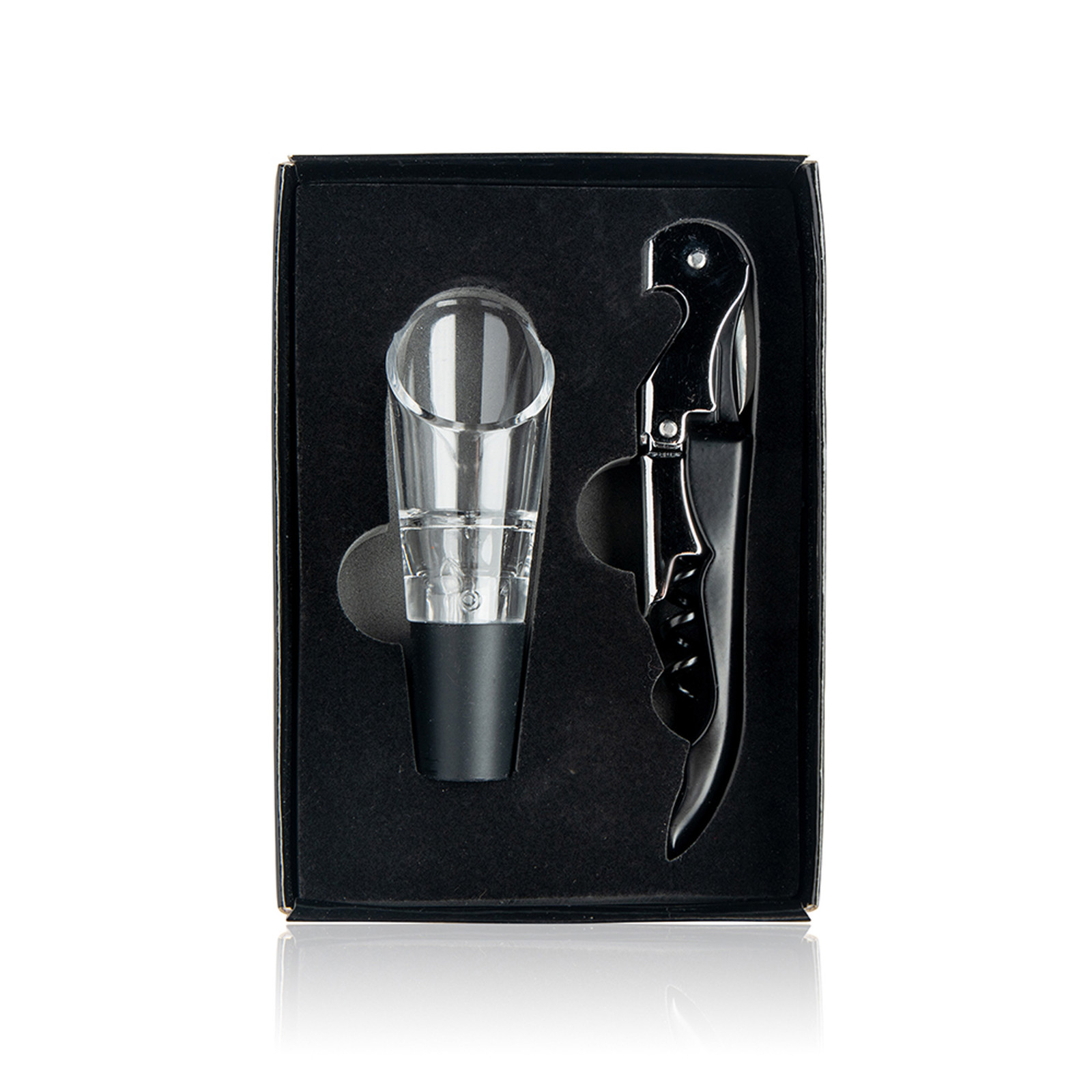 Service à vin en acier inoxydable, avec tire-bouchon et carafe. Un kit à vin glamour en inox, composé de deux parties aux quatre fonctions : décapsuleur, tire-bouchon, couteau de poche et carafe. En tant que cadeau complet, ce kit est livré dans une boîte cadeau noire, que vous pouvez personnaliser avec votre design.