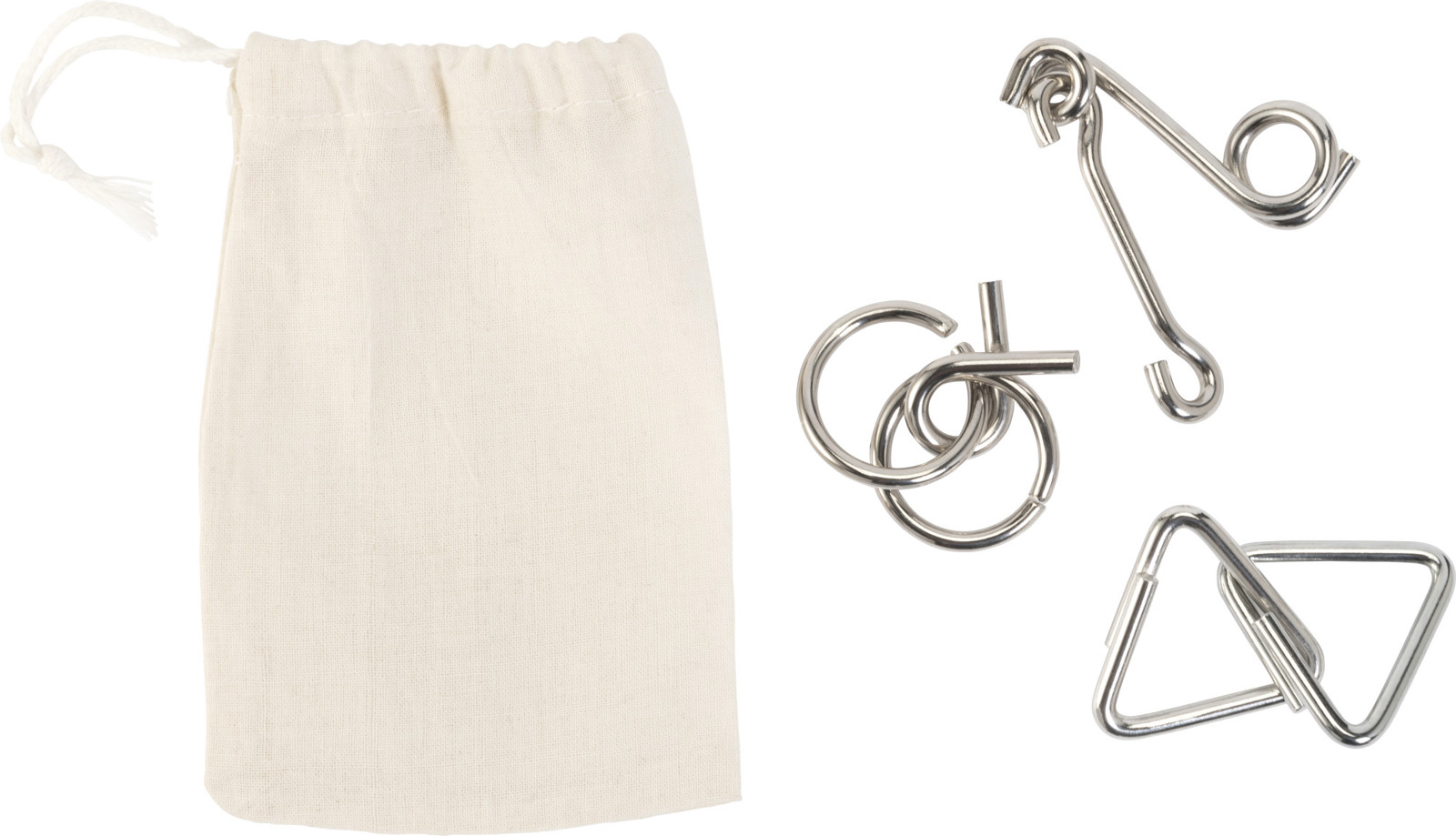 Set de 3 jeux de réflexion en métal dans une pochette en coton.