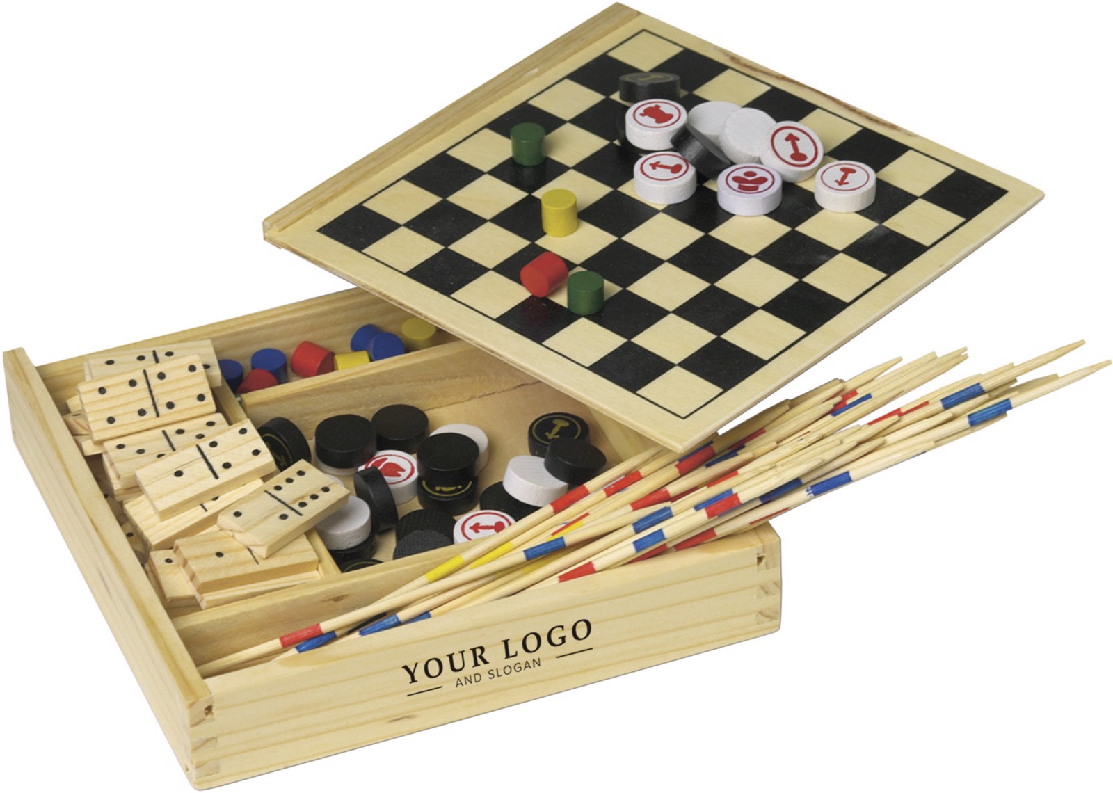 Set de 5 jeux dans un coffret en bois. Mikado , dames, échec, dominos et petits chevaux