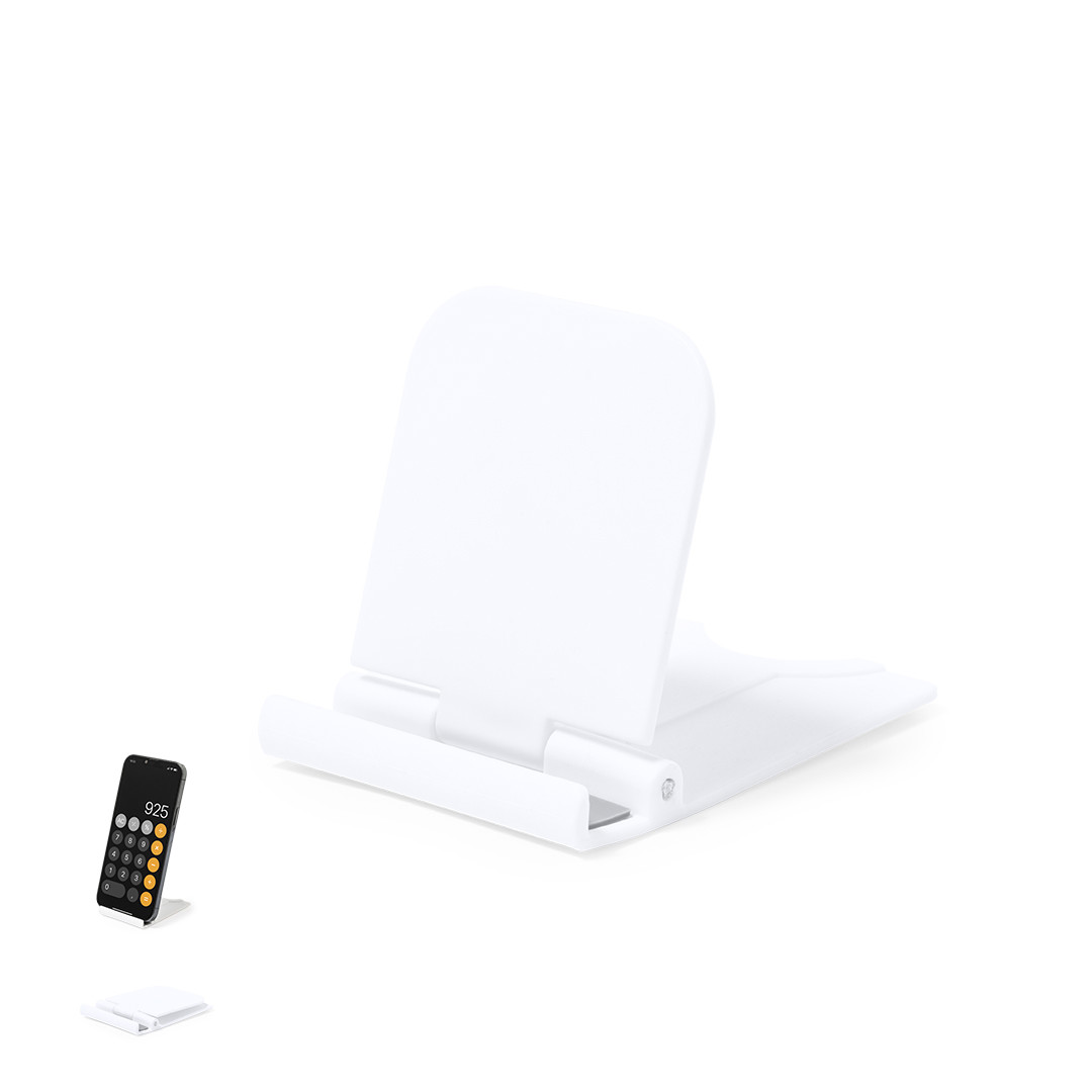 Support pour smartphone et tablette fabriqué en ABS robuste. De conception compacte et pliable pour pouvoir l'emporter partout. Avec différentes positions d'inclinaison et des coussinets de fixation. Présenté dans un sac individuel recyclé. Pliable