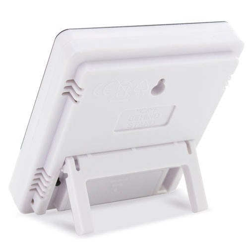 Station météo complète avec heure, calendrier et indicateur d’alarme. Sur votre écran, vous pouvez voir avec un simple dessin, s’il fait soleil, s’il pleut, s’il est nuageux... Il vous indique, en plus de la température et de l’humidité actuelles, le maximum et le minimum enregistrés le jour. Il a un gros bouton sur le dessus pour éteindre l’alarme confortablement.