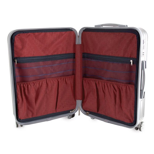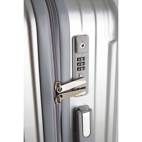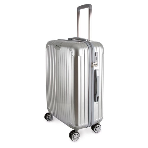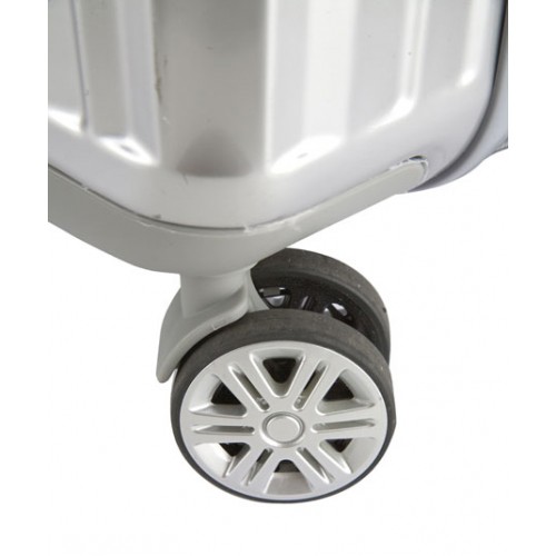 Chariot de luxe de 20 "parfait pour tout voyage, car sa taille est conforme à la norme de la cabine.Finition métallique avec un design nervuré et 4 roues doubles avec rotation à 360 ° pour un mouvement confortable. SERVI SANS MARQUAGE.