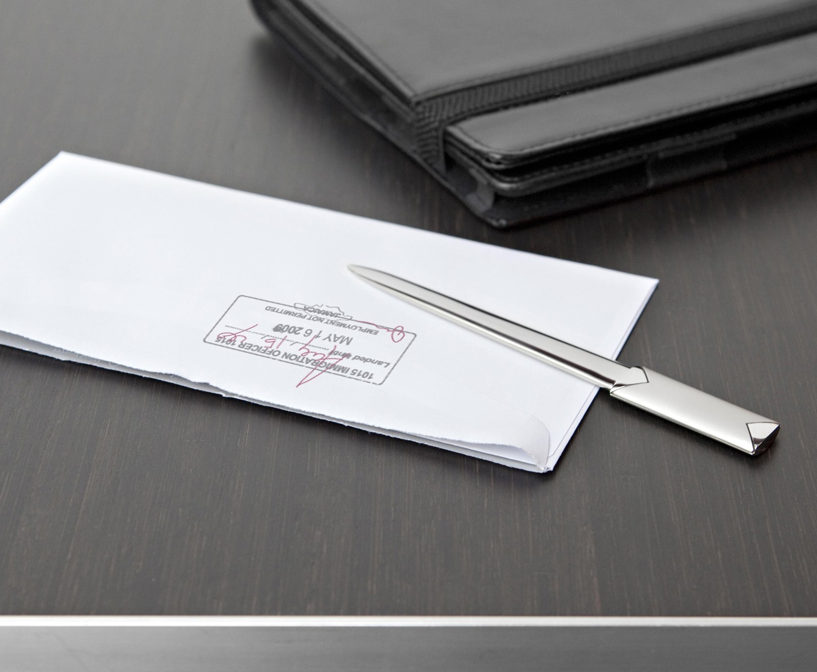 Abre-cartas de metal em estojo de oferta.