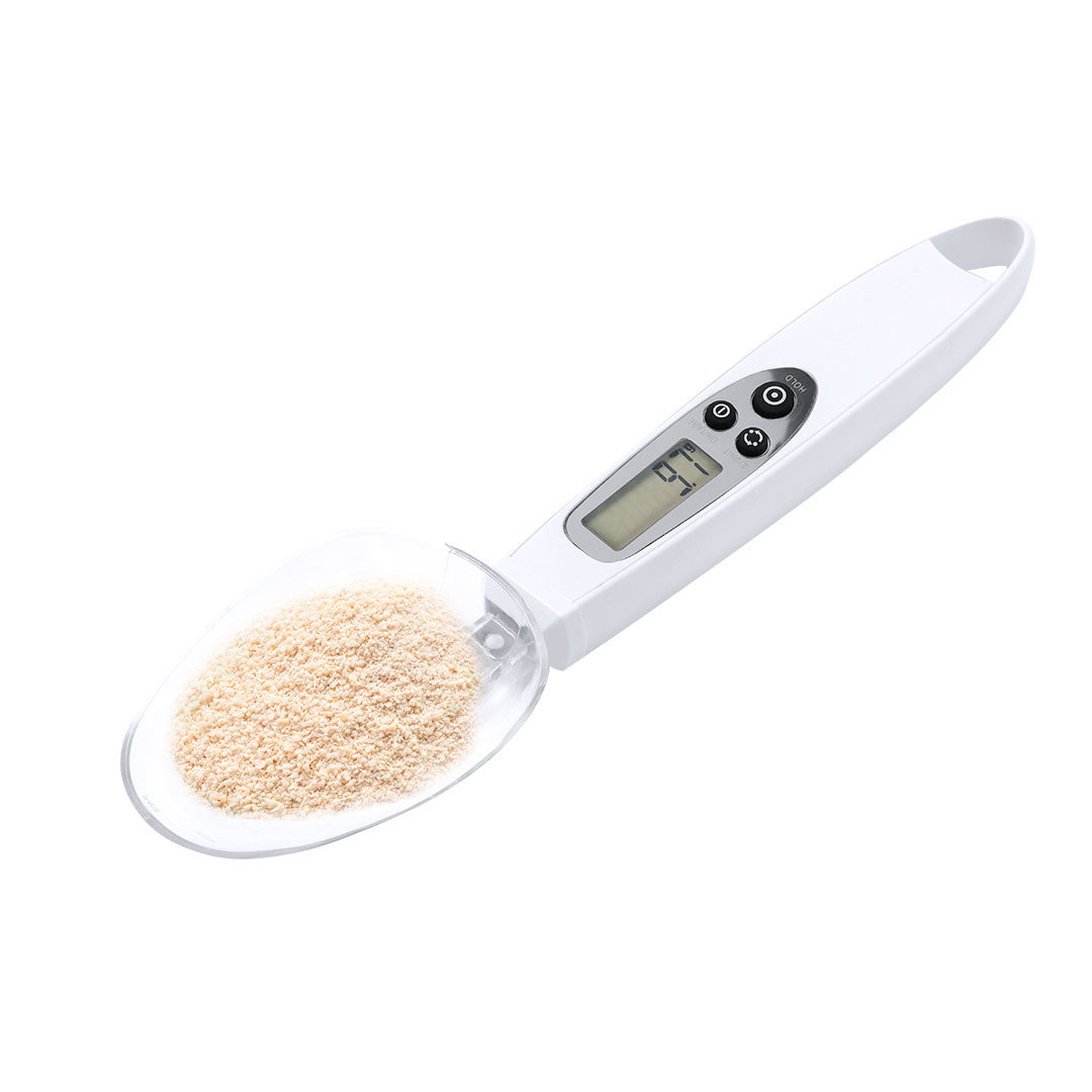 Prática balança digital com colher, válida para líquidos e sólidos. Inclui 2 colheres intercambiáveis e um visor digital LCD situado no cabo, que mostra a pesagem com uma precisão de 0,1 g. Botão para mostrar o peso em gramas (g), onças (oz) ou mililitros (ml), com função de memória e possibilidade de pesar dois ingredientes. Ambas as colheres têm gravada uma escala de medição adicional para líquidos: a colher pequena de 5 ml a 25 ml; e a colher grande de 10 ml a 50 ml. Com manual de instruções em espanhol e inglês. Alimentada por uma pilha de botão (incluída) e apresentada individualmente numa caixa de design kraft. 2 Acessórios 50 ml e 25 ml. Max 300 g. Pilha Botão Incluída