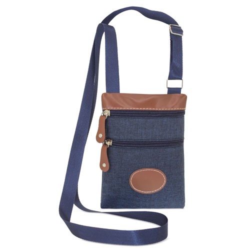Práctica bandoleira com a que podrás levar os teus pequenos objetos cómodamente e siempre á mao. Realizada em tecido com textura bitono cor marinho com detalhes em polipele. Se compoe de dois bolsos independentes exteriores e outro da parte traseira, no que poderás levar as suas coisas de mais valor. Com a sua fita ajustável poderás levar-lo colgado tipo bolsa ou mais ajustado ao corpo para mais seguridade.