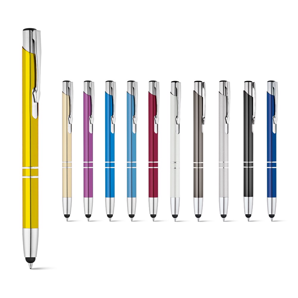 Esferográfica em alumínio com clipe. O pormenor da ponteira touch torna este brinde sofisticado e adaptável às novas tecnologias. Disponível numa variada gama de cores. Escrita a azul. ø10 x 138 mm