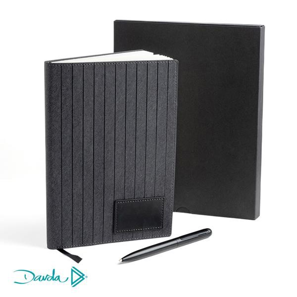 Set Davda com bloco A5, capa em PU, e esferográfica. Um set com a qualidade que a marca Davda já nos habituou. Um bloco com capa em PU, texturada, com um patch especial para personalização. Uma esferográfica em metal com um clip retrátil, twist e com escrita azul. Estes elementos elegantes embalados numa caixa de cartão estilo envelope, em cor preta. Versátil, útil, elegante e imperdível.