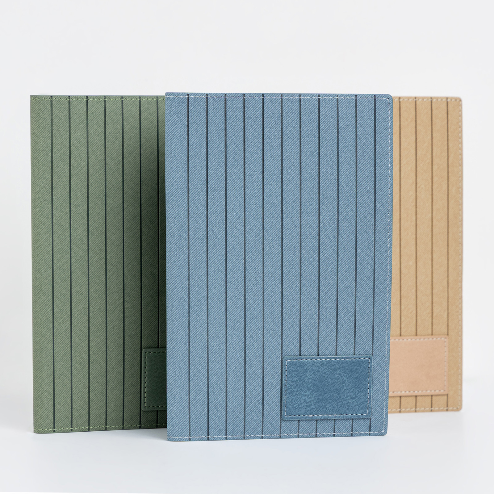 Campanha inclui impressão 1 cor, na capa. Bloco de notas A5 com capa em PU texturada e patch especial para personalização. Contém folhas lisas de papel proveniente de florestas sustentáveis (FSC). Ideal como brinde corporativo elegante e ecológico, com embalagem em sleeve de cartão preto.