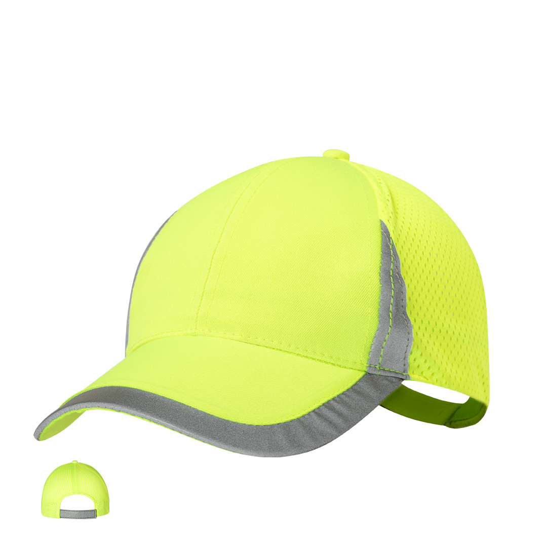 Tampa desportiva em poliéster macio. Fecho de velcro ajustável e costas com malha respirável. Em amarelo fluorescente com detalhes reflexivos na língua, frente e zíper. 6 Painéis. Refletor. Fecho Velcro