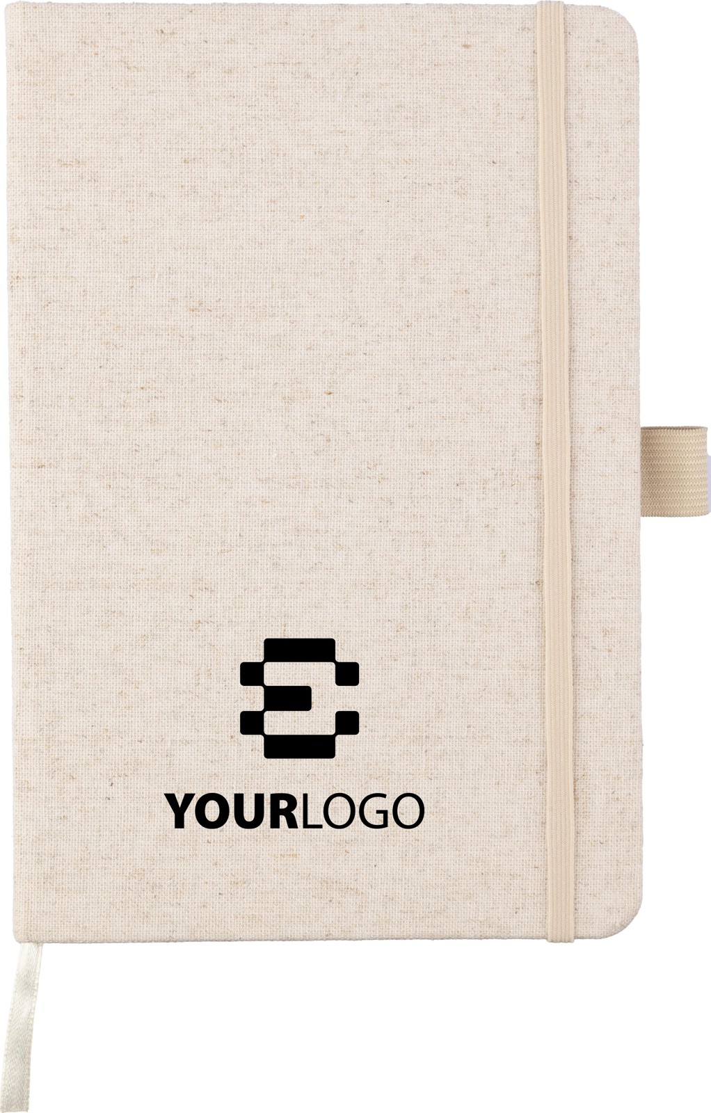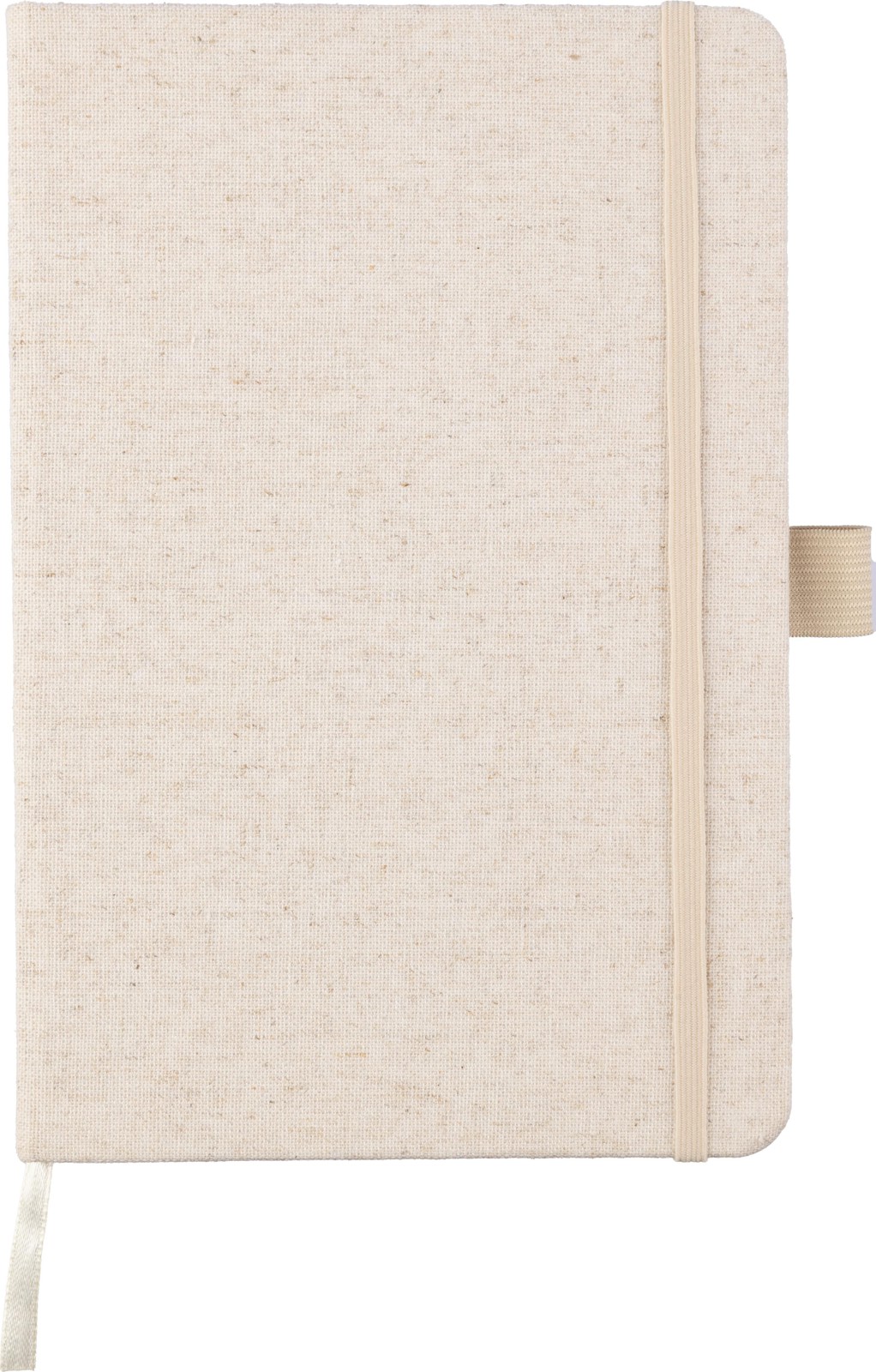 Caderno de cânhamo (aprox. A5) com 80 páginas, com suporte para esferográfica, elástico e fita em uma cor natural à copndizer. Inclui um logotipo de cânhamo na parte de trás da capa.