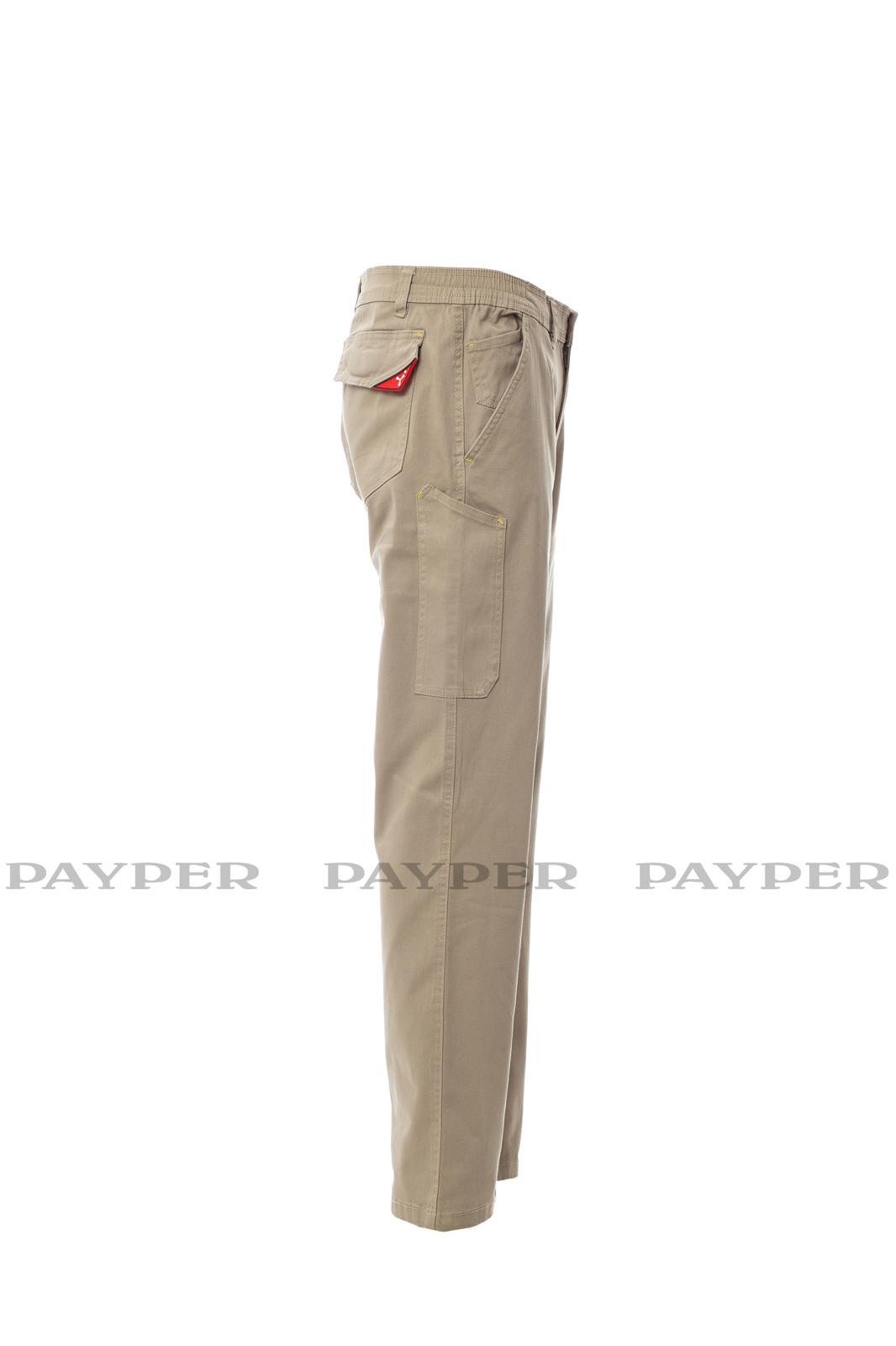 Calças com presilhas e elástico na cintura, fecho de correr e botão. Dois bolsos clássicos na frente, pequeno bolso para moedas, bolso para metro do lado direito, bolso do lado esquerdo com paleta de fecho LOCK SYSTEM, dois bolsos atrás, dos quais um com paleta e velcro. Costura tripla.