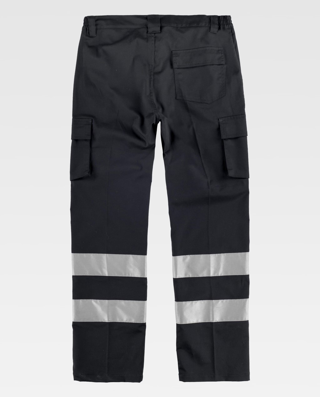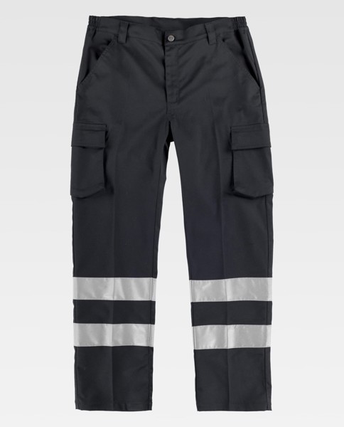 Calças de visibilidade melhorada com fitas reflectoras em modelo desenho slim fit. Dois bolsos de abertura inclinada nos lados, dois bolsos de carga laterais com lapela de velcro. Um saco de plastão traseiro com lapela de velcro. Duas fitas reflectoras nas presilhas das pernas. Elásticos laterais na cintura. Presilhas para o cinto. Fecho de botão e fecho de correr.