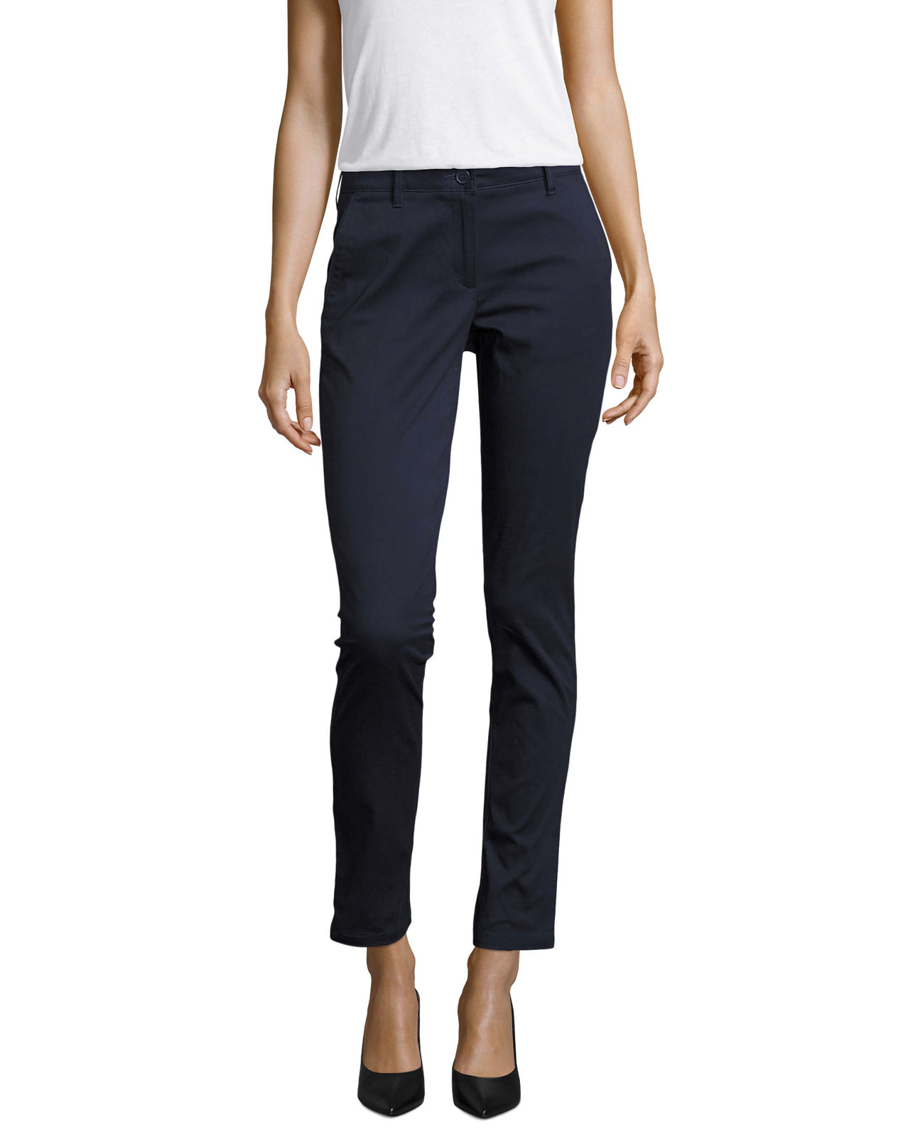 CALÇAS STRETCH ACETINADAS PARA SENHORA Bolsos frontais estilo italiano Corte justo 2 bolsos traseiros inseridos Bolso para moedas Presilhas para cinto