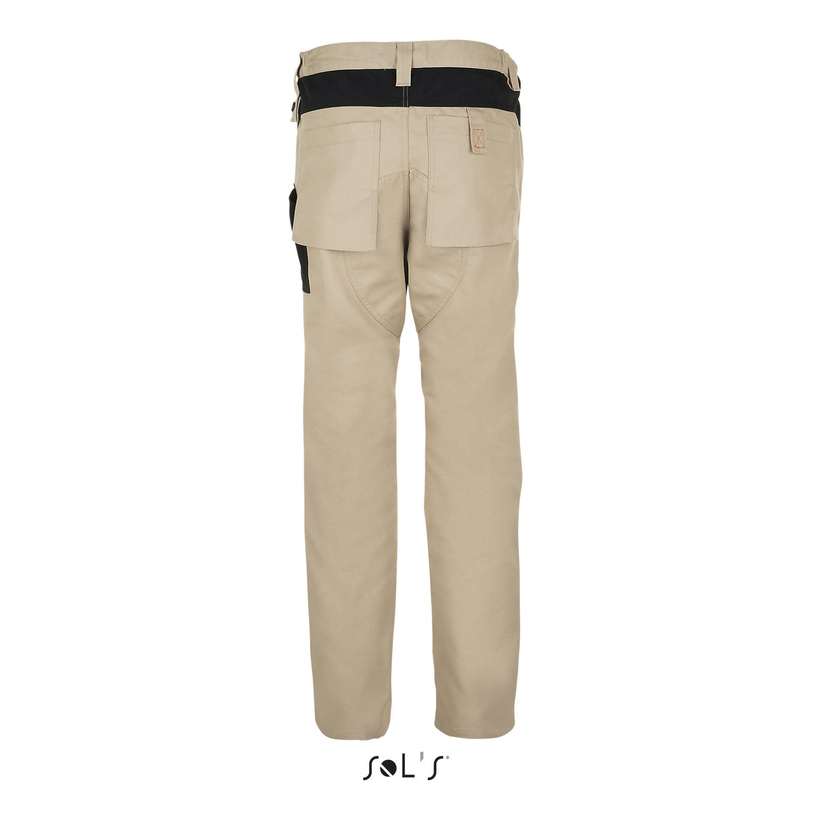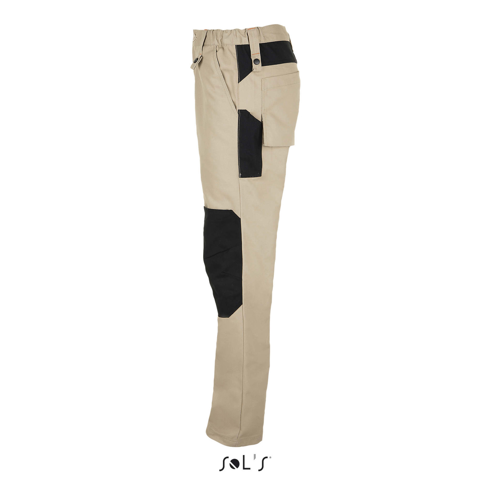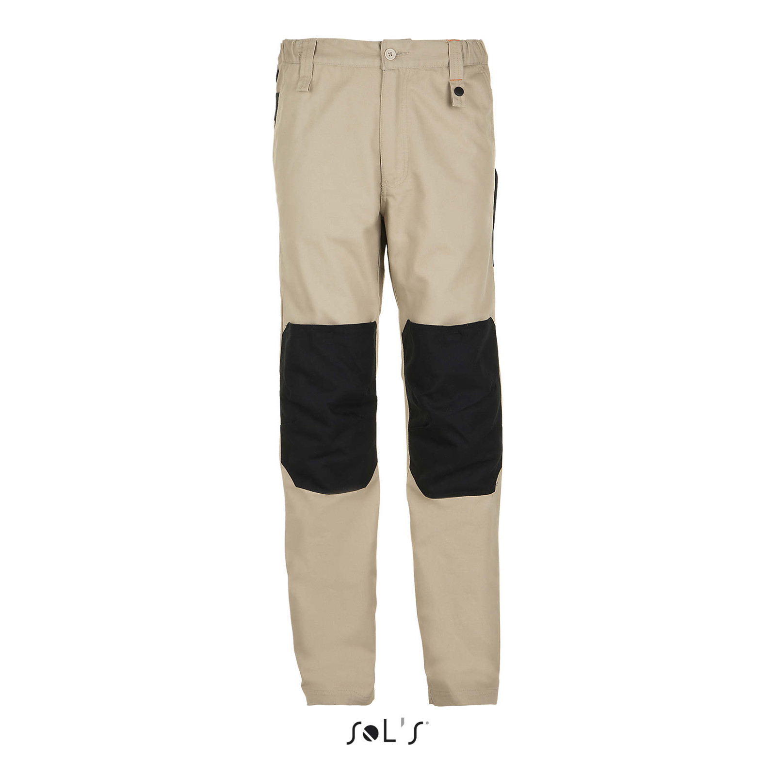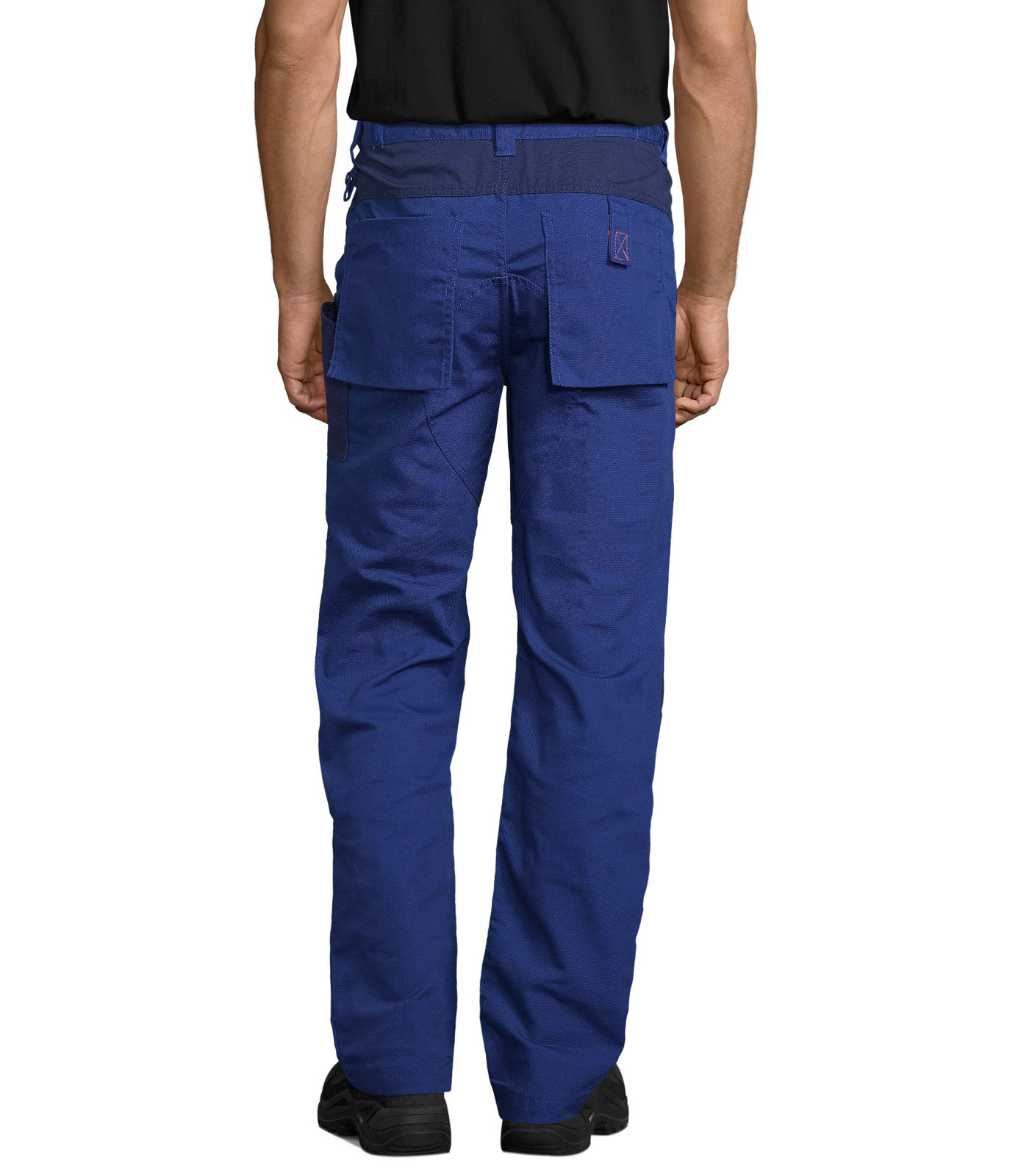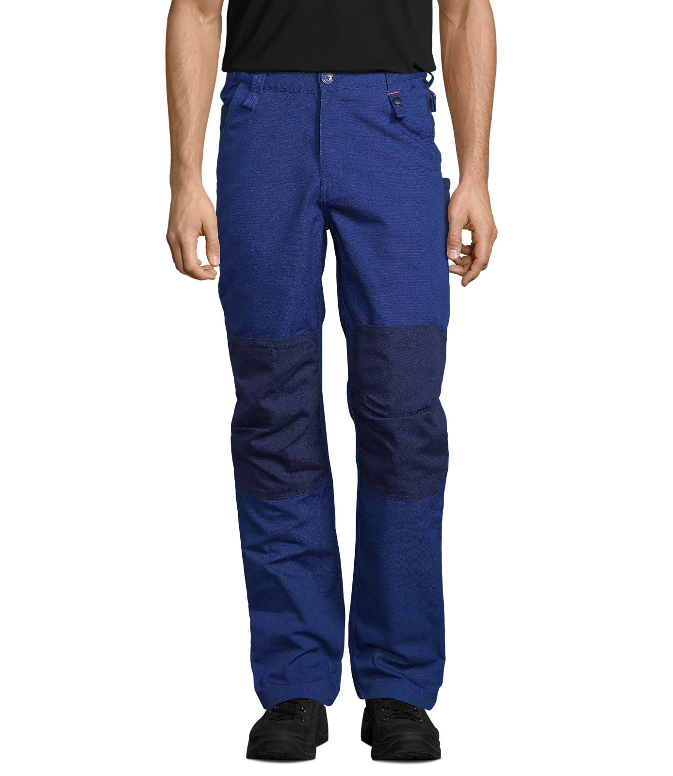 CALÇAS DE TRABALHO BICOLOR PARA HOMEM Fecho de correr Presilhas para cinto Cintura semi-elástica Encaixes para joelheiras removíveis 6 bolsos (2 bolsos frontais - 1 bolso inserido - 1 bolso lateral para ferramentas - 2 bolsos traseiros tipo coldre) Presilhas com molas para prender bolso amovível Bloco Pro Etiqueta interior para personalização manual