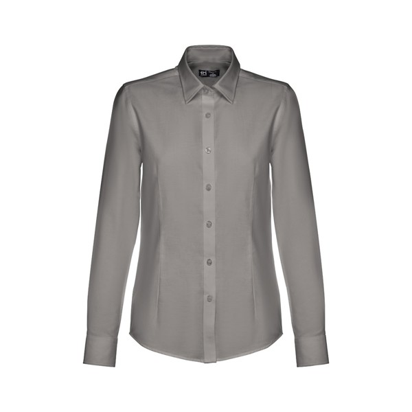 Camisa oxford de manga comprida para senhora em 70% algodão e 30% poliéster (130 g/m²). Contém punhos ajustáveis com 2 botões e manga com 1 prega. Camisa cintada com duas pinças na zona da frente e das costas e carcela com 7 botões de cor pérola. Tamanhos: S, M, L, XL, XXL