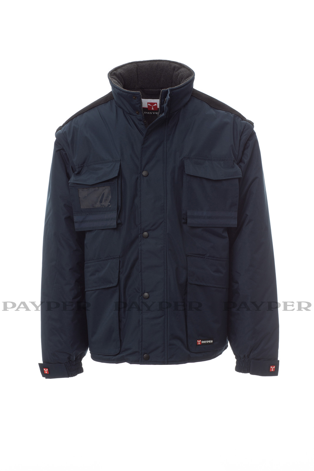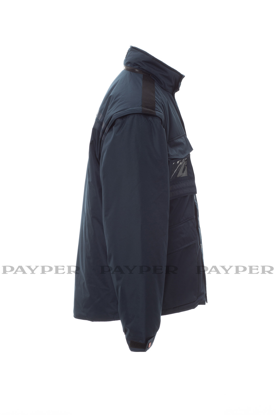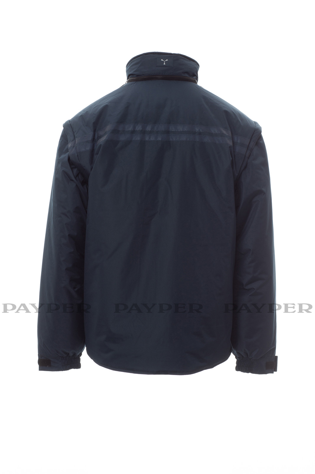 Casaco Intercontinental 2.0 de homem com mangas destacáveis, com pinças presas no interior. Fecho de correr de 5 mm de plástico e com cursor de metal, paleta e botões em plástico, capuz oculto na gola, punhos ajustáveis, faixas refletoras na mesma cor na frente e costas, respiradouro lateral com reforço e fecho de correr. Cinco bolsos exteriores, um dos quais é um porta-crachá reversível. Interior acolchoado, colarinho, costas e parte inferior das costas mais quentes em micro-polar e inserções de axilas respiráveis, cordão interior e fecho de correr para facilitar a estampagem ou a aplicação de bordados.