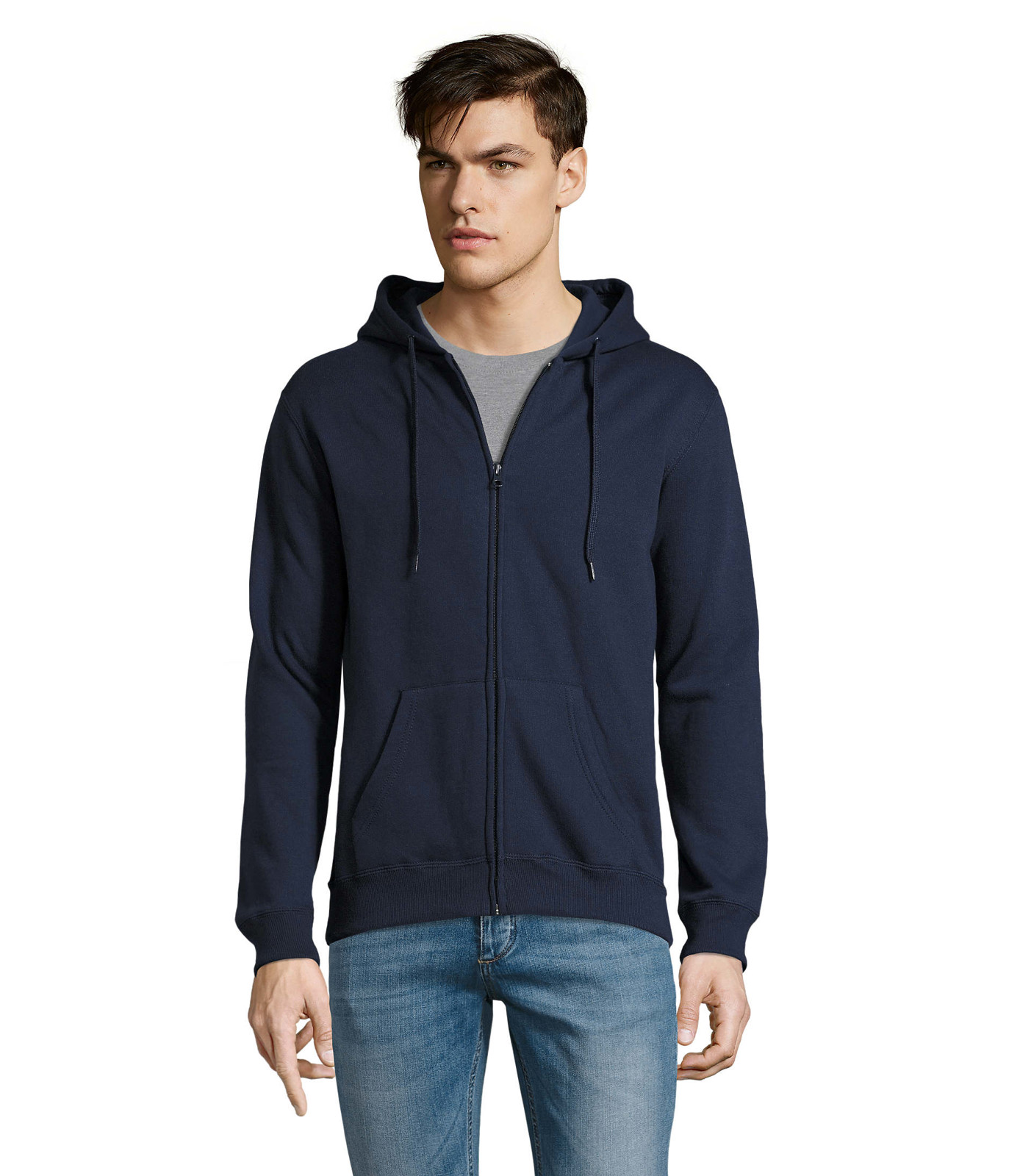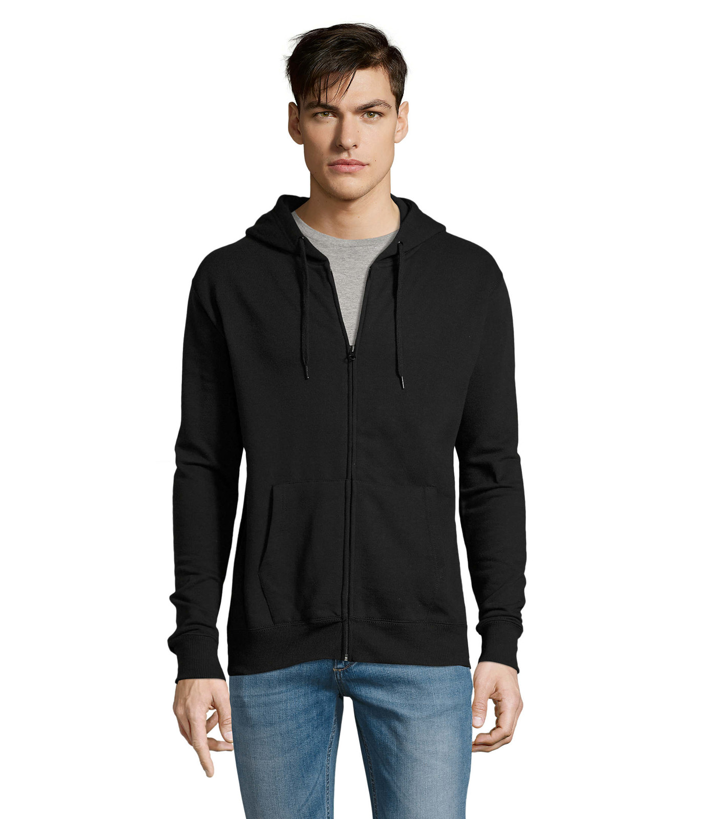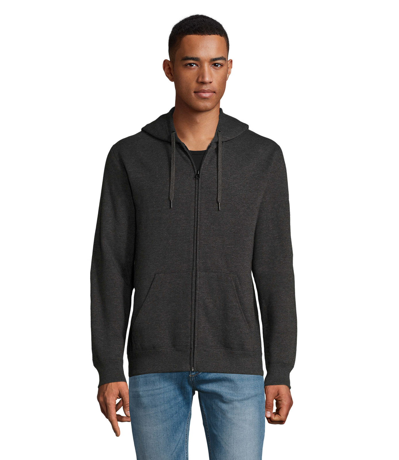 Casaco com capuz forrado para homem, com punhos e parte inferior em elastano canelado. Mangas inseridas para maior conforto, dois bolsos tipo marsupial, capuz forrado com cordão ajustável e fecho inserido. Corte cintado que realça a silhueta, cuidadosamente cortado e cosido.