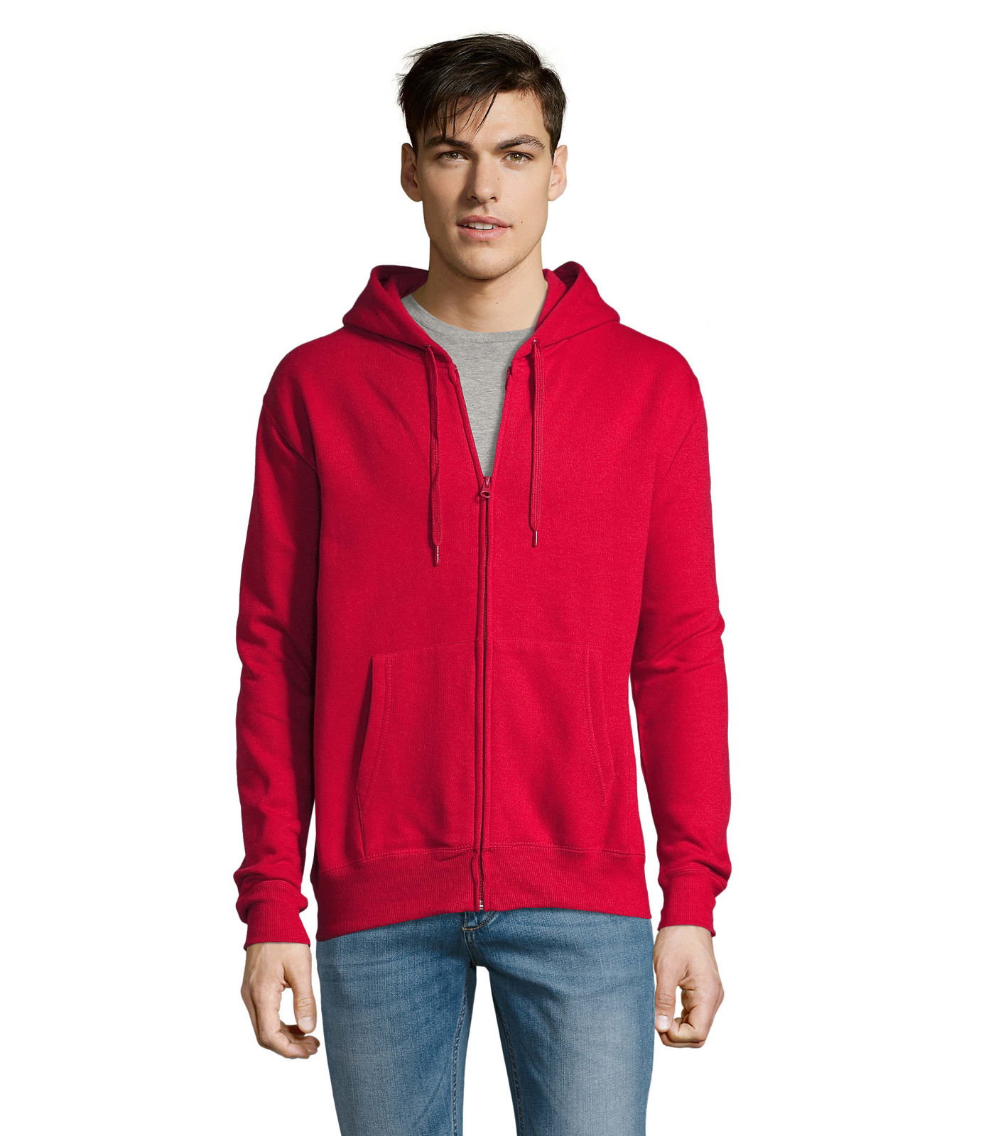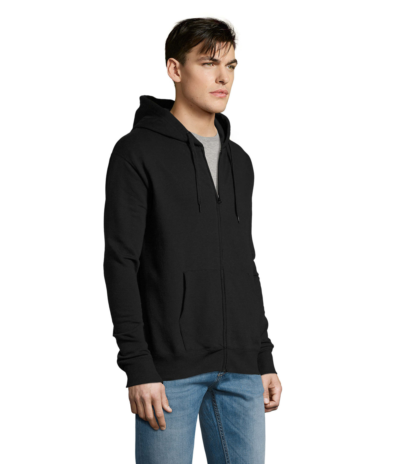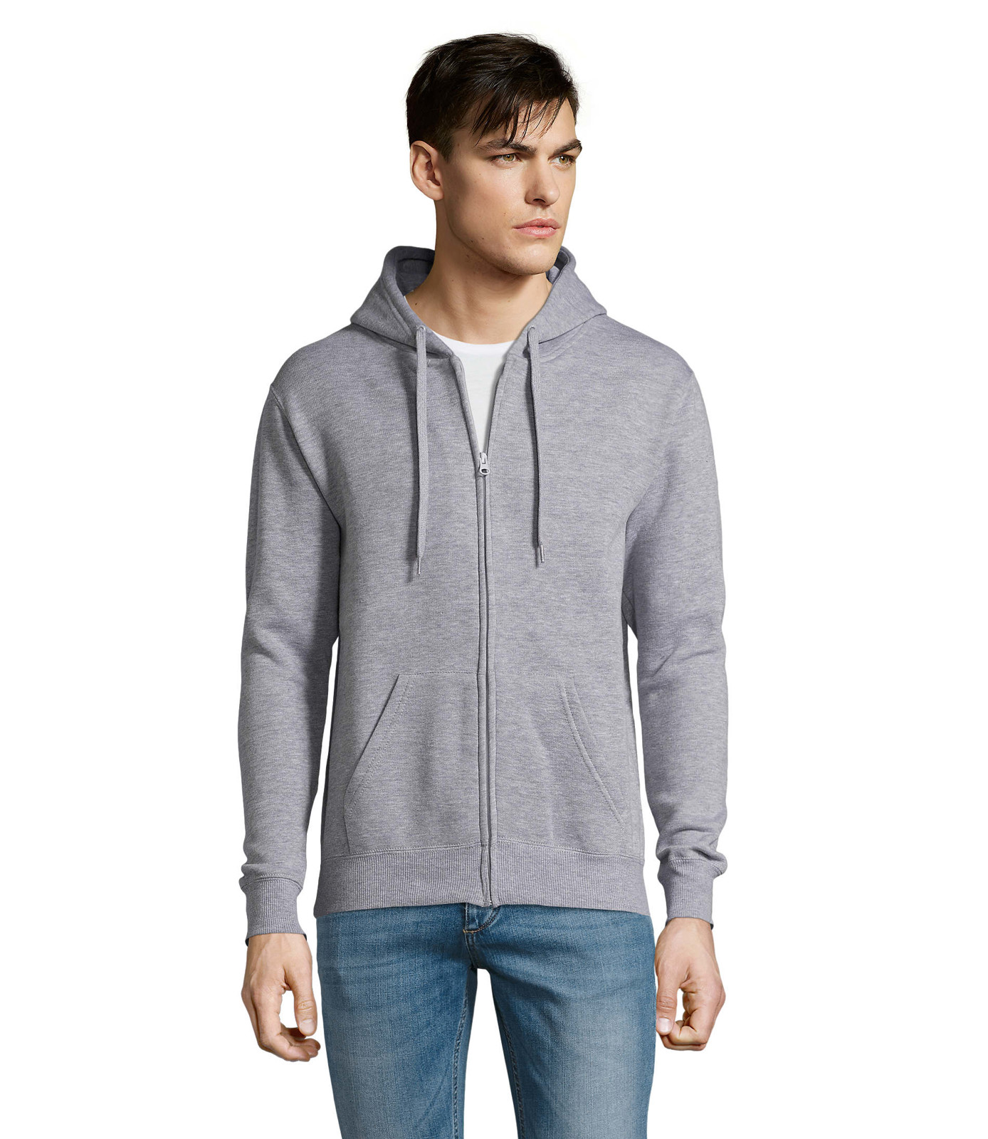 Casaco com capuz forrado para homem, com punhos e parte inferior em elastano canelado. Mangas inseridas para maior conforto, dois bolsos tipo marsupial, capuz forrado com cordão ajustável e fecho inserido. Corte cintado que realça a silhueta, cuidadosamente cortado e cosido.