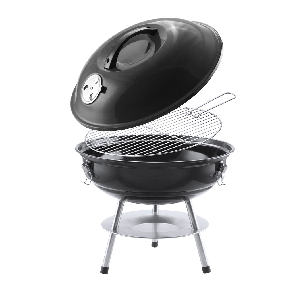 Barbecue fabricado em resistente aço de carbono de acabamento preto. Tampa com cómoda asa e orifícios de ventilação, com grelha metálica, prato antigotas e pés antideslizantes. Apresentado numa atrativa caixa de design.