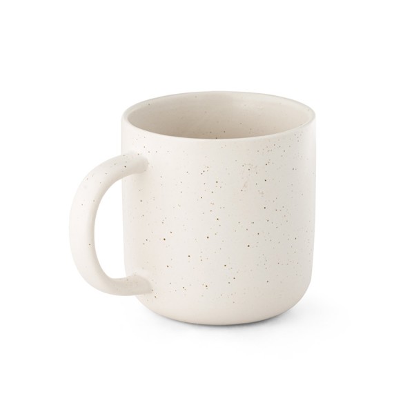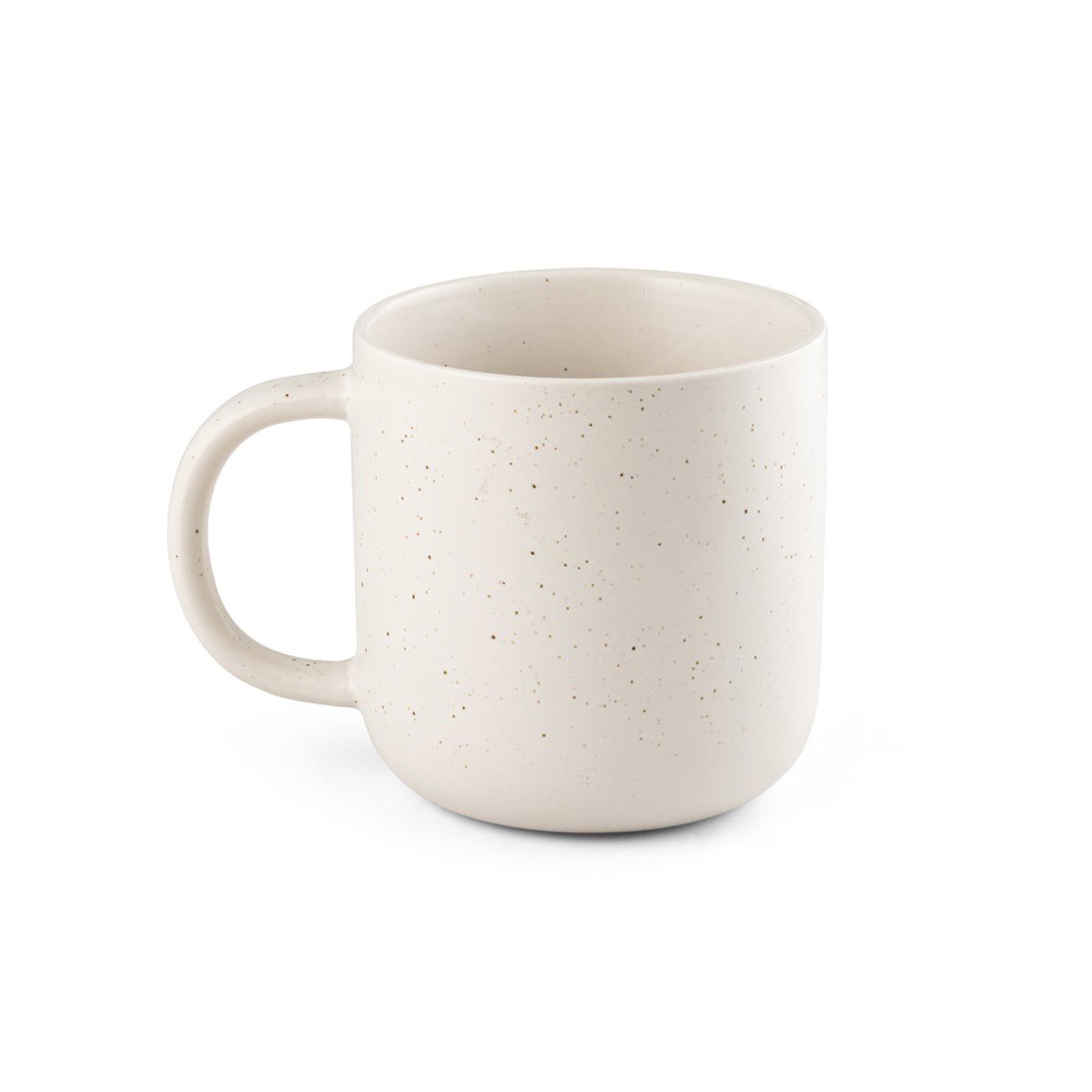 Caneca em cerâmica com acabamento mate e exterior com efeito rústico. Capacidade até 370 mL. Fornecida em caixa de oferta em papel kraft. A caneca pode ser lavada na máquina de lavar louça e resiste, pelo menos, a 125 ciclos de lavagem (incluindo impressão), de acordo com a norma EN12875-1. ø85 x 85 mm