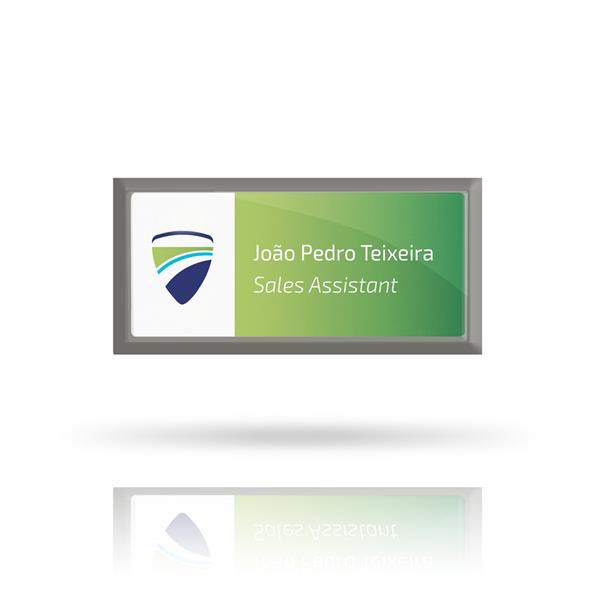 Personalize este identificador magnético mate 69x34mm de forma rápida e fácil. Mantém-se em todos os tipos de tecidos com uma forte aderência sem os danificar. É ideal para identificar o utilizador perante o público.