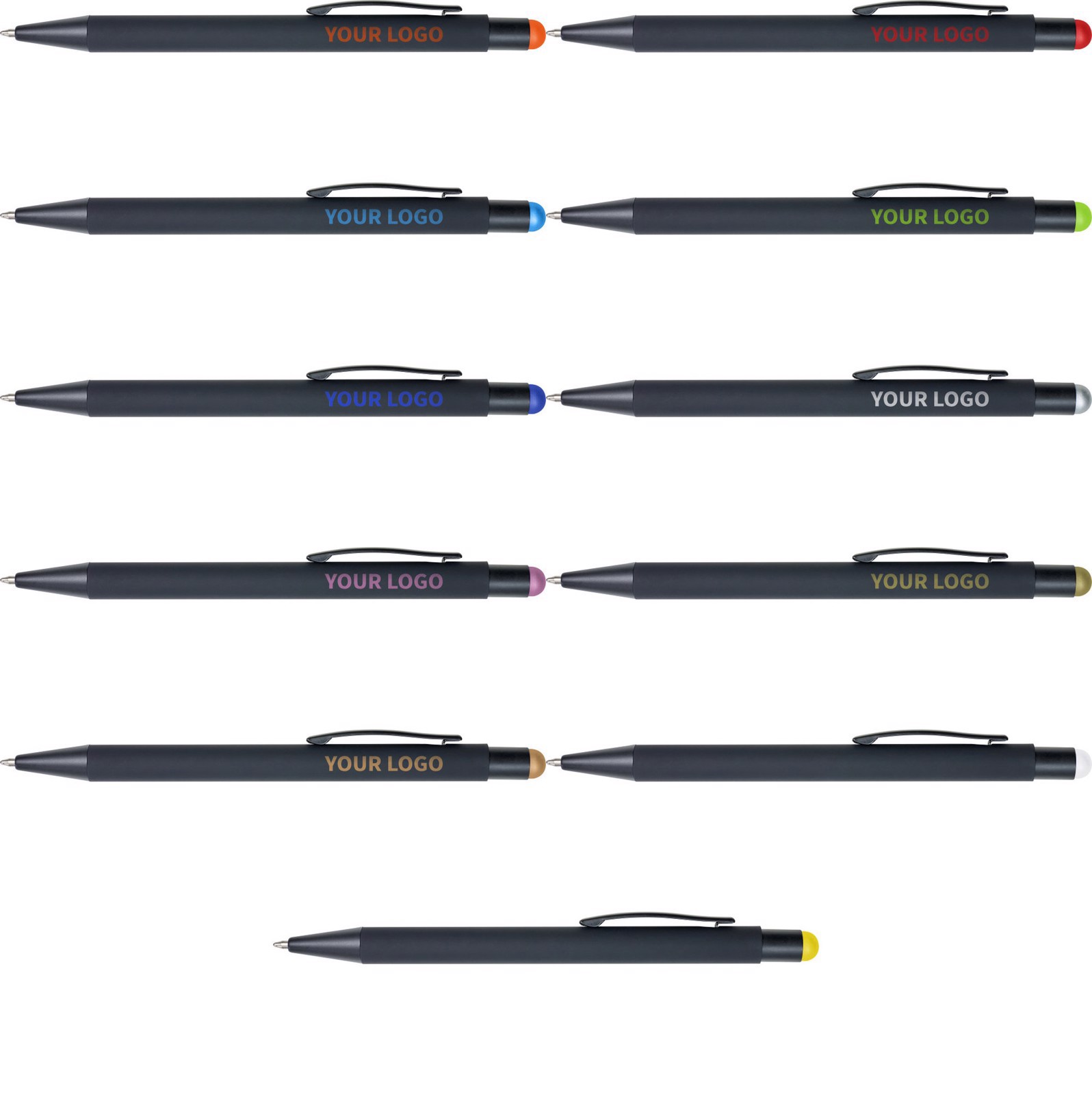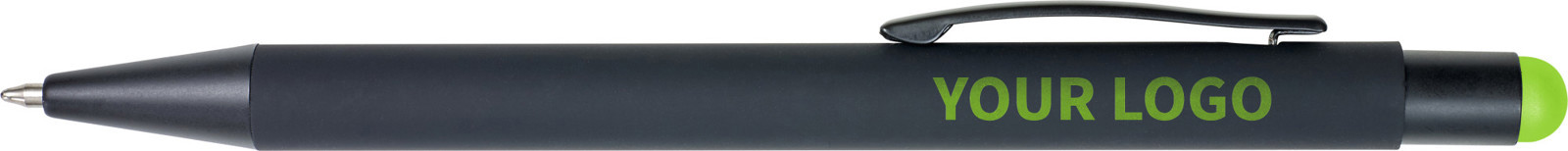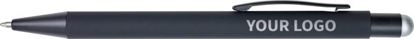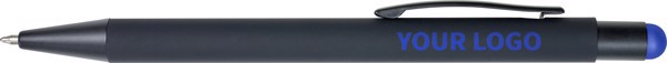 Esferográfica preta revestida em borracha, tinta azul e ponteiro para ecrã táctil. O interior do corpo e o ponteiro são coloridos. Quando o artigo for personalizado a laser, o logo aparecerá à condizer com o ponteiro.