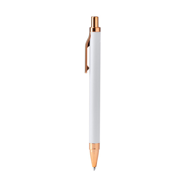 Campanha inclui gravação a laser, 1 face. Esta caneta esferográfica é feita de alumínio reciclado com acabamento fosco e detalhes em cor de cobre. Possui um refil de tinta azul jumbo, que proporciona uma escrita suave e uso prolongado.
