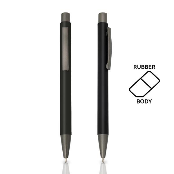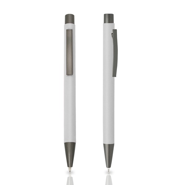 Esferográfica de alumínio com corpo de borracha. Escrita azul e sistema pulsar. Com uma vasta gama de cores, esta esferográfica junta as vantagens de uma caneta de alumínio ao suave toque da borracha. De corpo colorido e detalhes cinza.