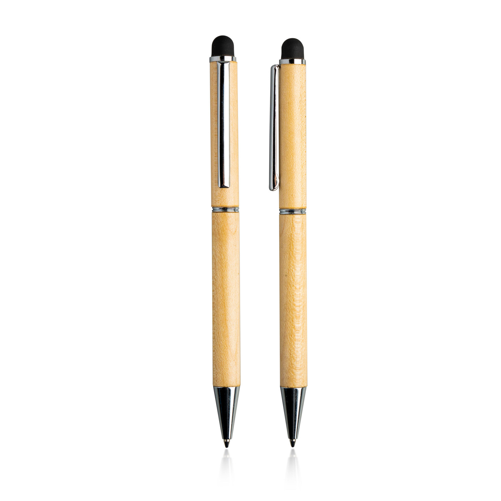 Esferográfica em madeira com touch. Esta esferográfica, amiga do ambiente, combina um corpo de madeira com um clip de metal. Com touch, funciona por sistema twist. É de escrita azul.