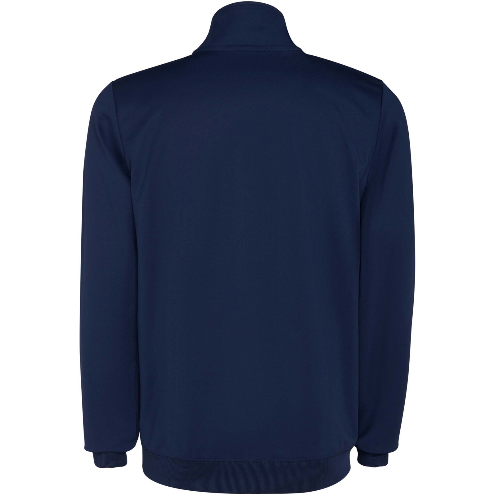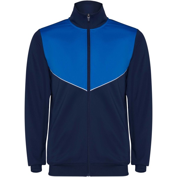 Fato de treino em tecido leve e elástico. Casaco de cor contrastante e detalhes cosidos no peito. Gola alta com costuras em contraste. Fecho de correr frontal central. Bolsos laterais. Punhos e cintura canelados 2 x 2. Calças com cós elástico e cordão. Peça lateral em contraste com detalhe cosido. Bainha com fecho de correr.