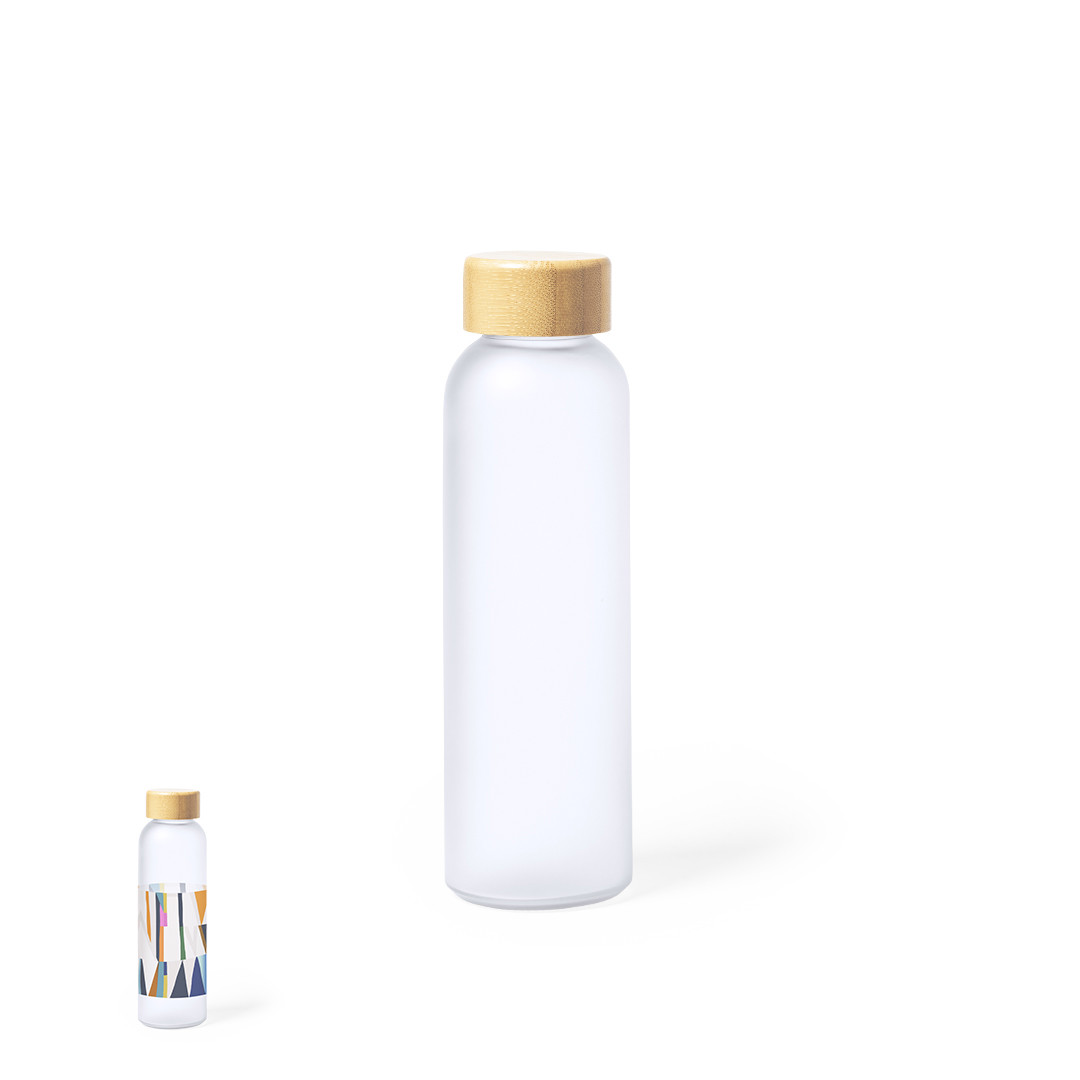 Garrafa da linha nature e 500ml de capacidade, faricado especialmente para impressão em sublimação. Corpo fabricado em vidro, com tampa de rosca de bambu e livre de BPA. Apresentada numa caixa individual de design eco. 500 ml