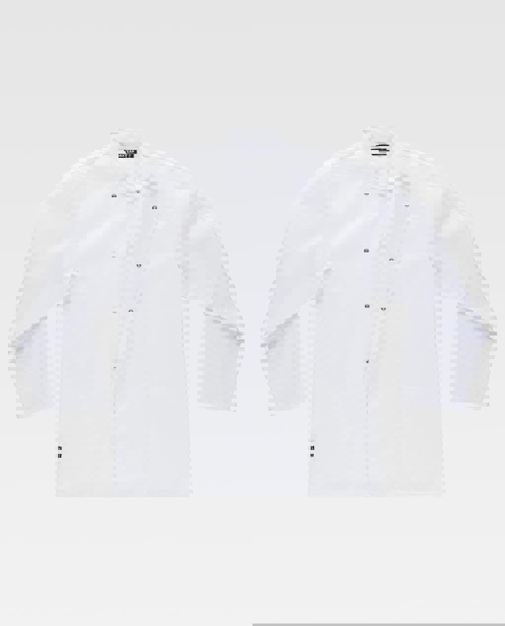 Jaleca básica unissex de manga comprida para cozinha. Gola Mao e fecho cruzado oculto com colchete. Um bolso compartimentado na manga. Alça para fixação do pescoço do avental.