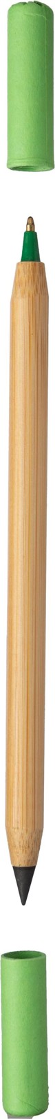 Lápis e esferográfica sem fim de bambu. Um lado com lápis sem fim e o outro com esferográfica, ambos com tampa de papelão colorida. Tinta azul.