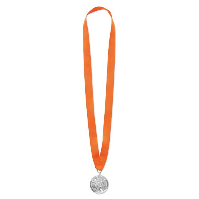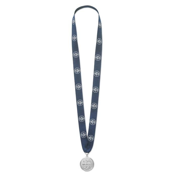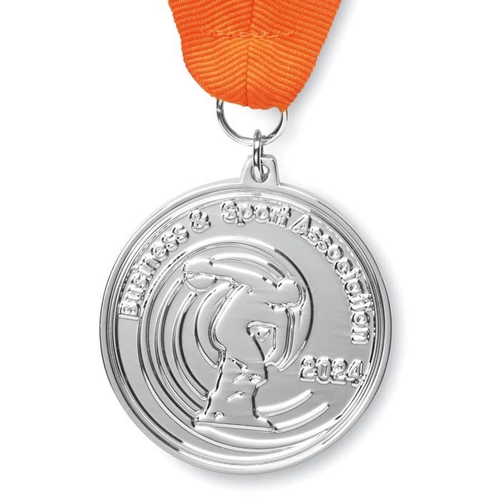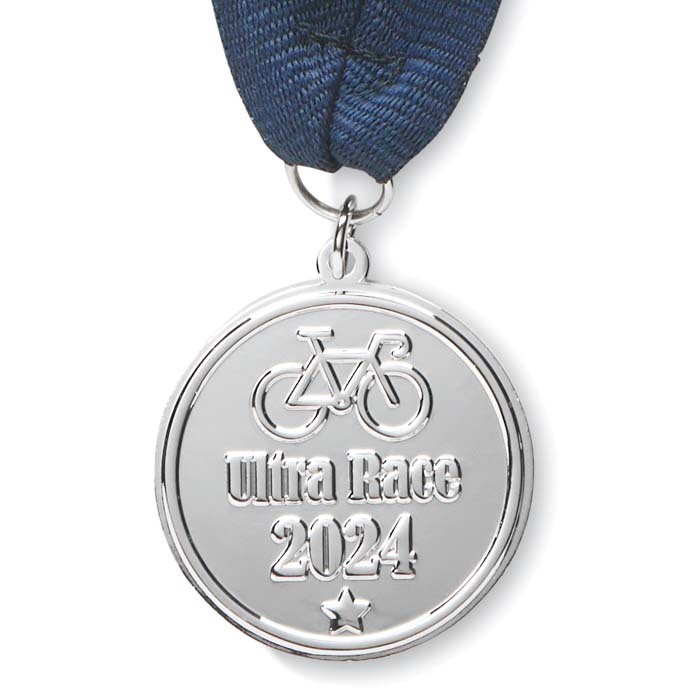 Medalhas de ferro personalizadas com fitas de poliéster ou rPET de 80 cm costuradas em V, impressas em cores em ambos os lados com largura de 20mm, 25mm, 30mm ou 35mm.. As medalhas têm um desenho em relevo que não é esmaltado no anverso. Um logotipo gravado pode ser adicionado no verso. Nomes e números individuais podem ser gravados no verso de cada medalha. Com acabamento liso ou áspero. Escolha entre 8 cores diferentes de revestimento (Cobre, Zinco, Níquel ou Ouro, as 4 com versões normais e antigas) e selecione a que melhor se adequa ao seu desenho.